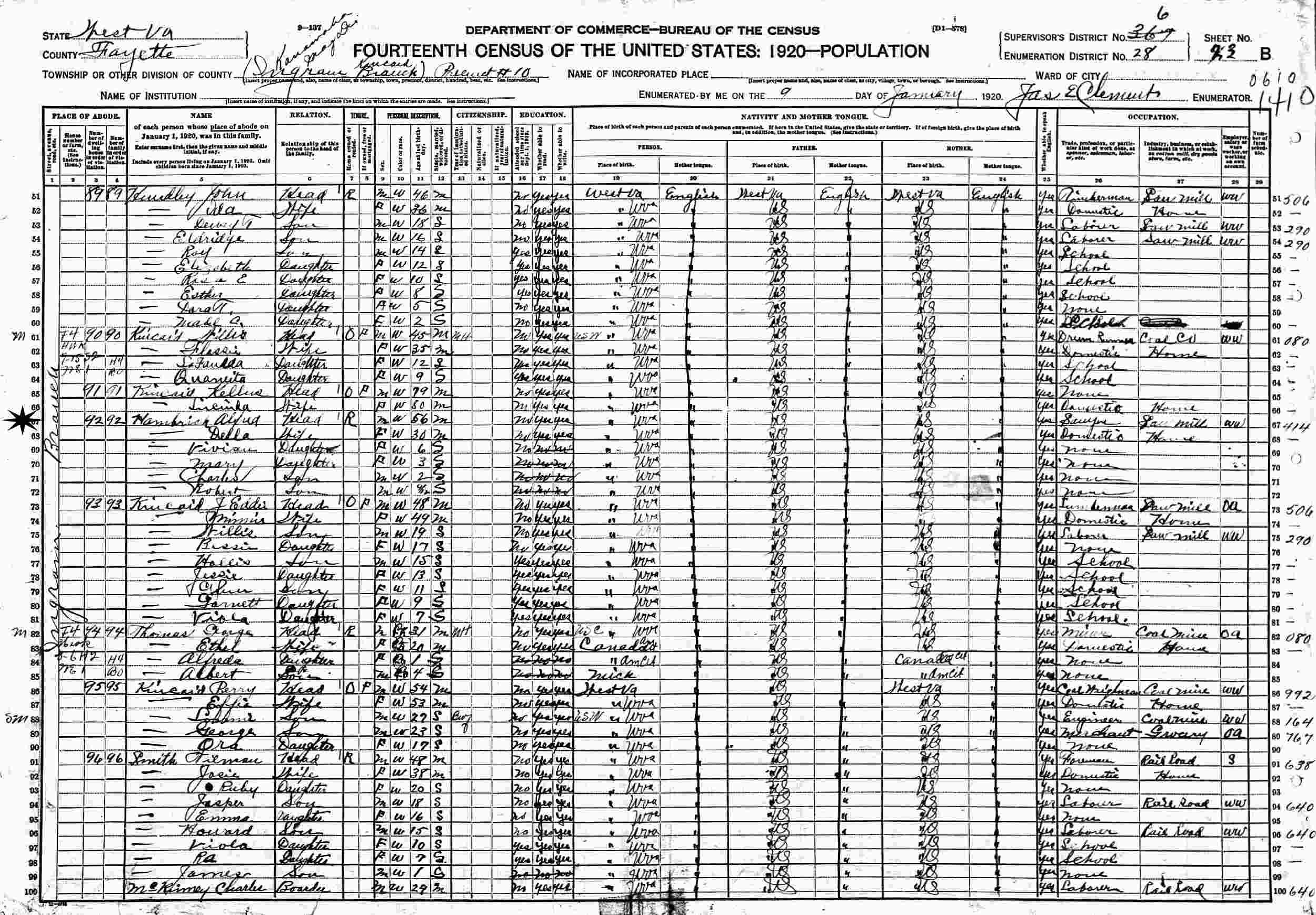 January 9, 1920 - Precinct 10, Supervisor's District 367 (crossed out to 6), Enumeration District 28, Kanawha Magisterial District, Ingram Kincaid Branch, Fayette County, West Virginia.