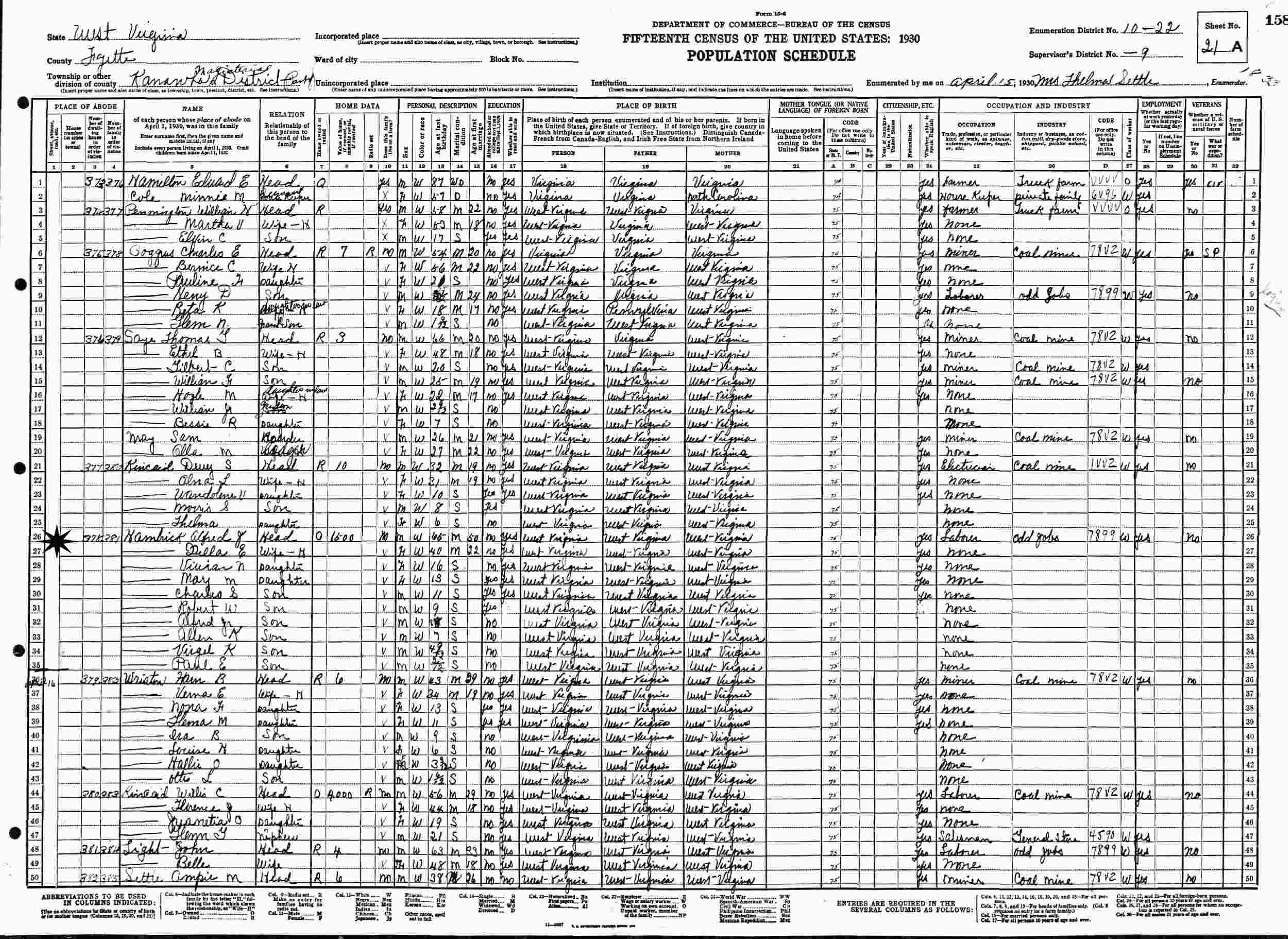 April 15-16, 1930 - Supervisor's District 9, Enumeration District 10-22, Kanawha Magisterial District, Fayette County, West Virginia.