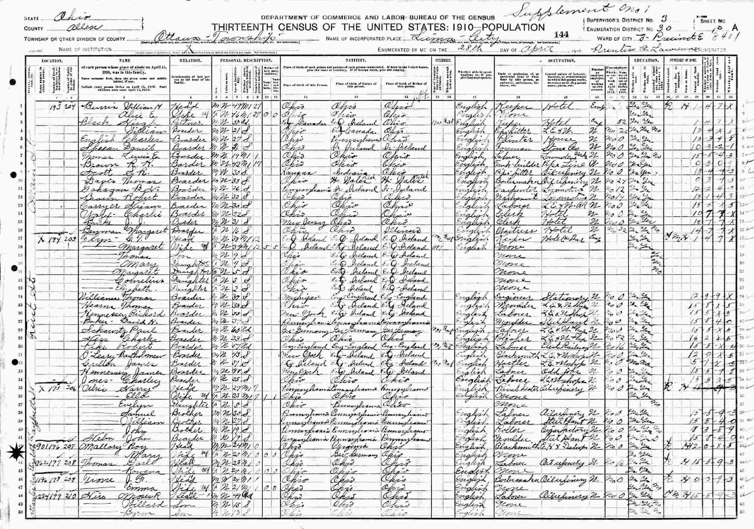 April 28, 1910 - 901 Elizabeth, Precinct E, Ward 3, Supervisor's District 3, Enumeration District 30, Ottawa Township, Lima, Allen County, Ohio.