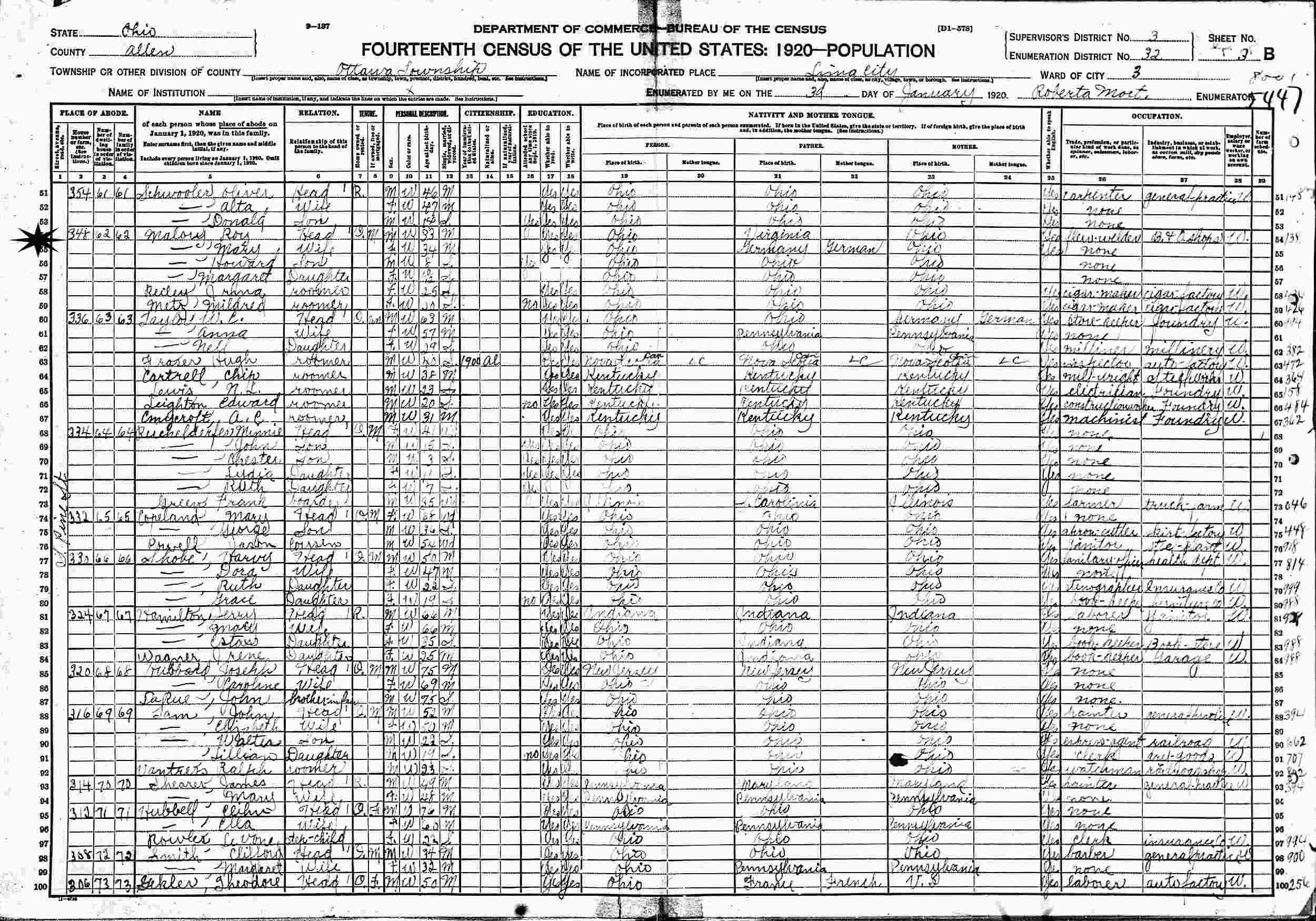 January 3, 1920 - 348 S. Pine Street, Ward 3, Supervisor's 3, Enumeration District 32, Ottawa Towship, Lima, Allen County, Ohio.