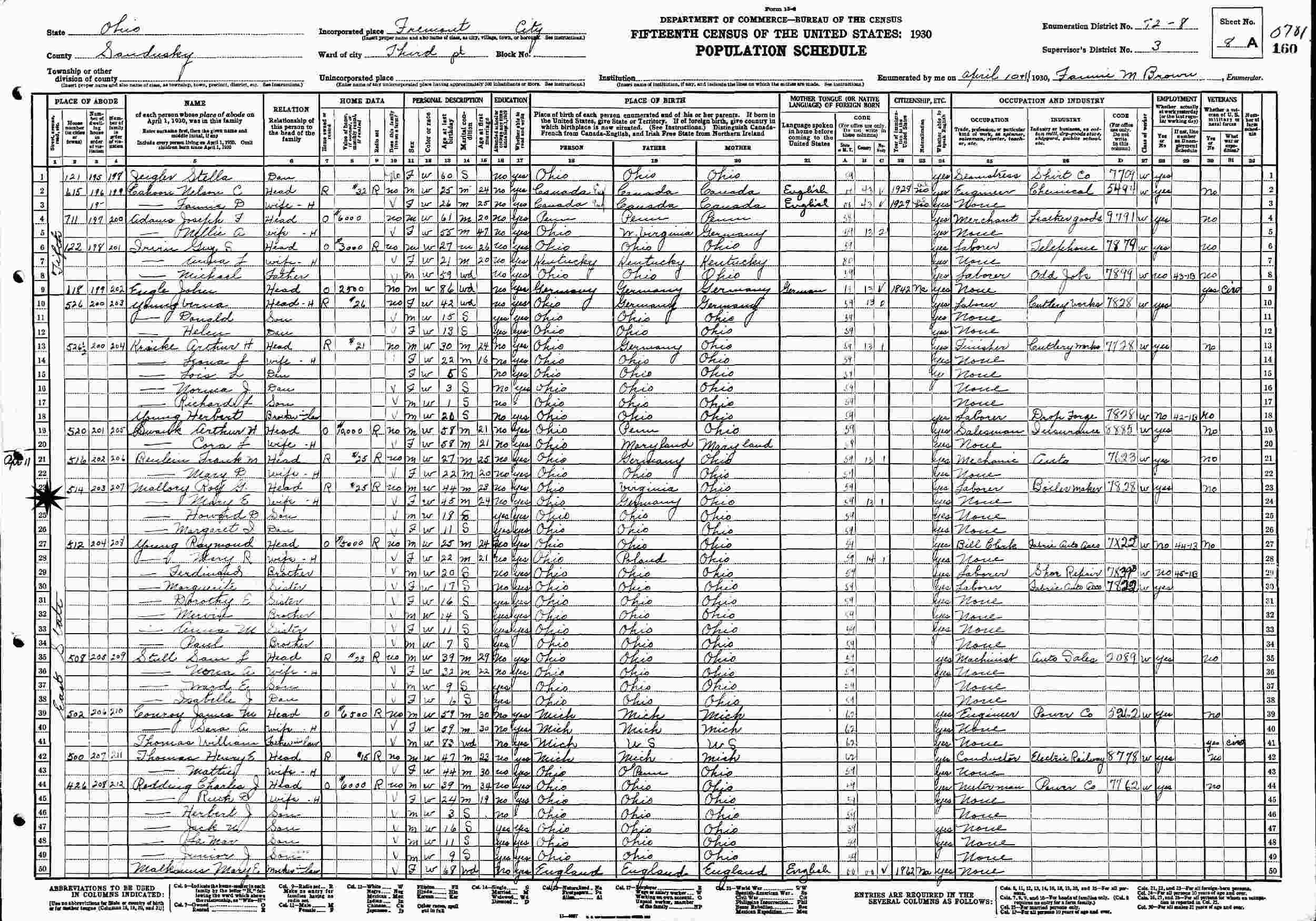 April 11, 1930 - 514 East State, Ward 3, Supervisor's District 3, Enumeration District 72-8, Fremont, Sandusky County, Ohio.