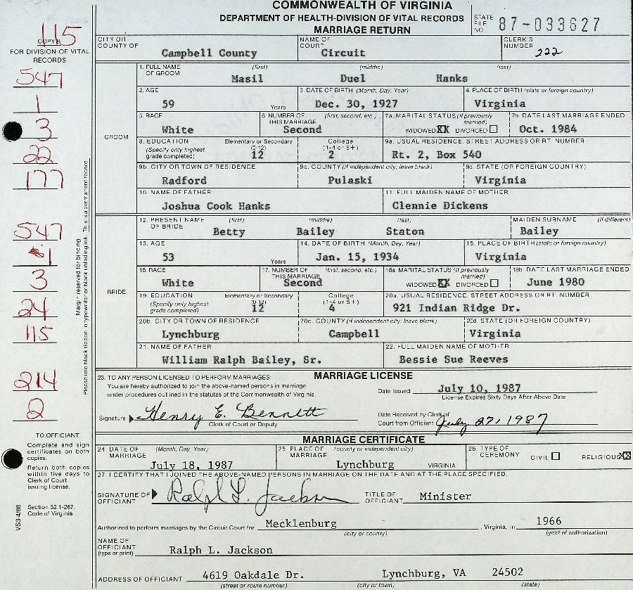(2) Betty (nee Bailey) Staton July 18, 1987 in Lynchburg, Virginia. (She married (1) LEONARD P STATON April 22, 1966, Lynchburg, Virginia. b. June 27, 1931, Amherst County, Virginia; d. June 1, 1980, Lynchburg, Virginia.)