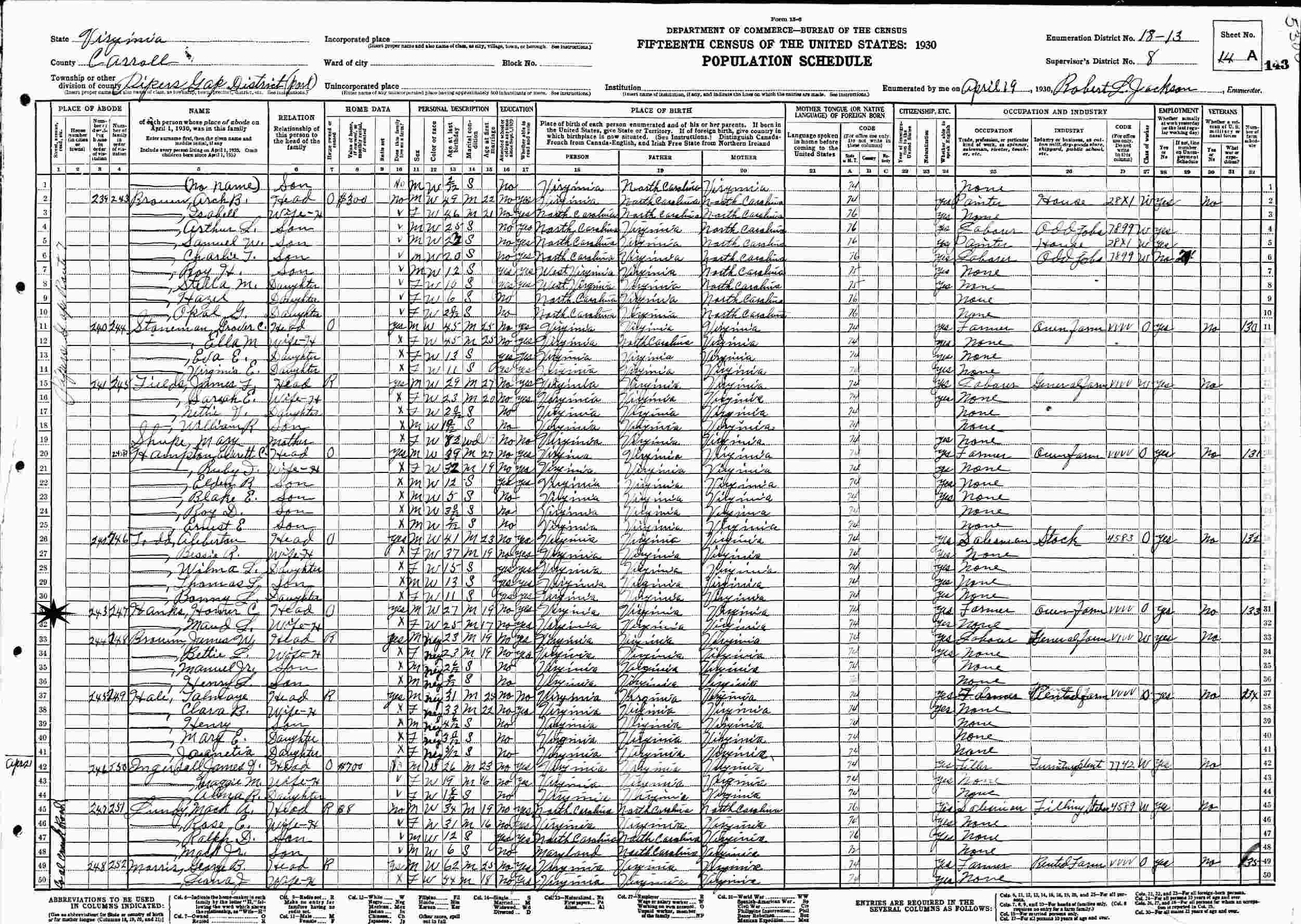 April 19, 1930 - Pipers Gap Route 7, Pipers Gap District, Supervisor's District 8, Enumeration District 18-13, Carroll County, Virginia.