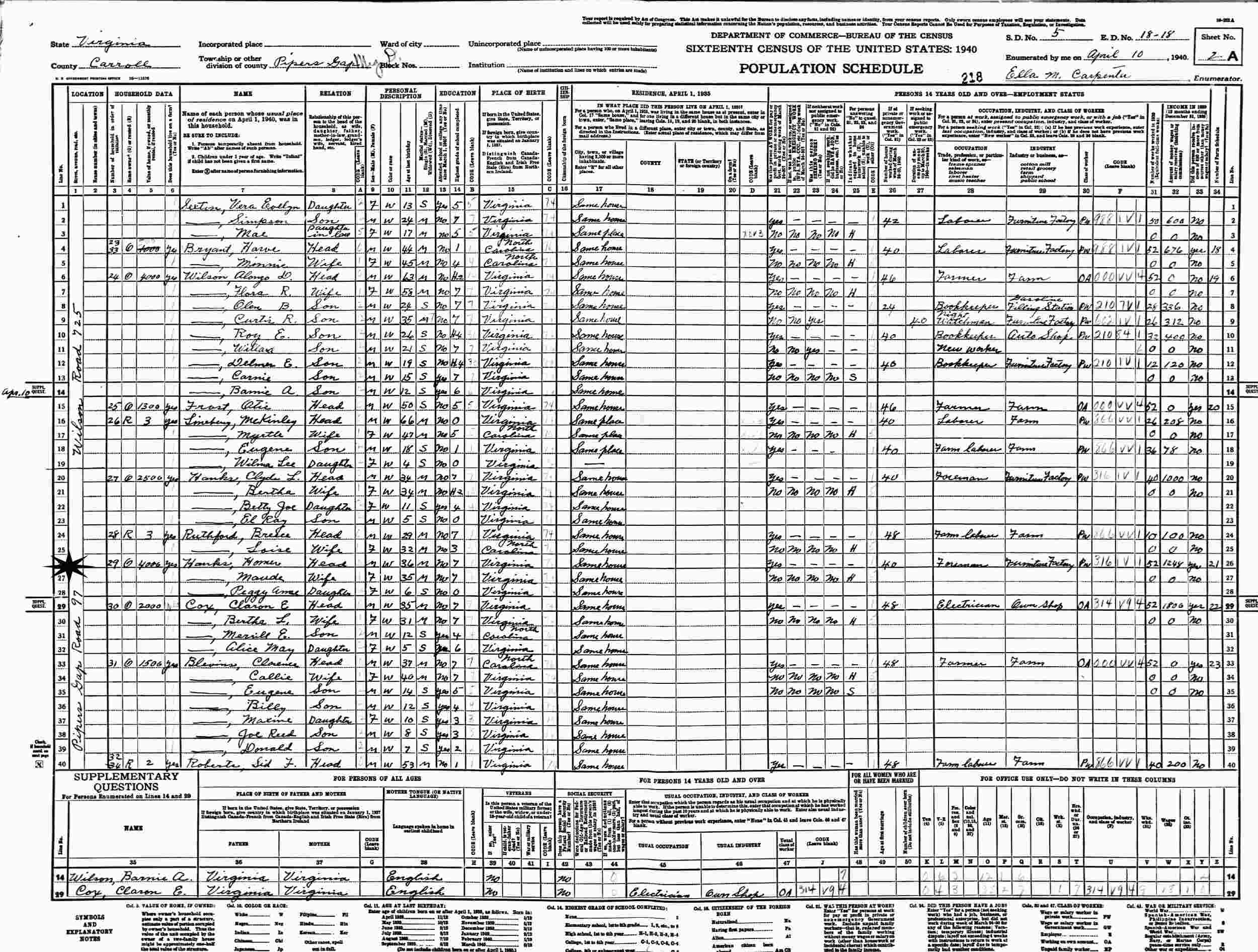 April 9, 1940 - Pipers Gap Road 97, Pipers Gap Magisterial District, Supervisor's District 5, Enumeration District 18-18, Carroll County, Virginia.