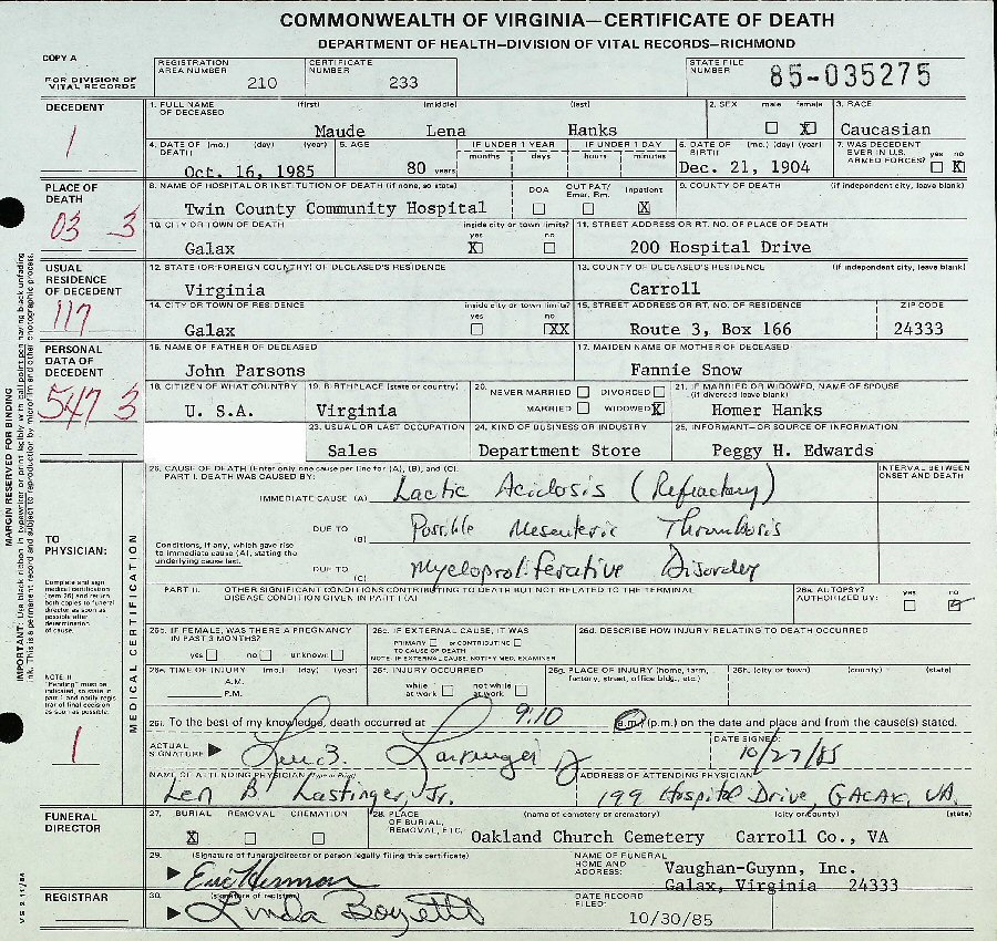 Died: October 16, 1985 in Twin County Community Hospital, Galax, Virginia.