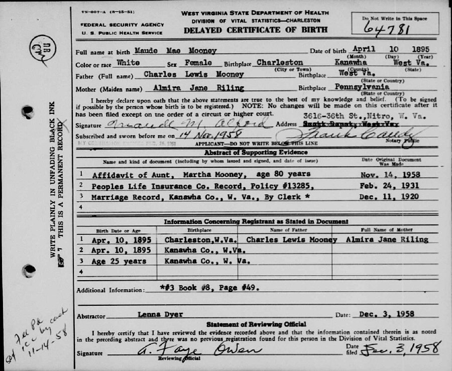 Born: April 10, 1895 in Charleston, Kanawha County, West Virginia.