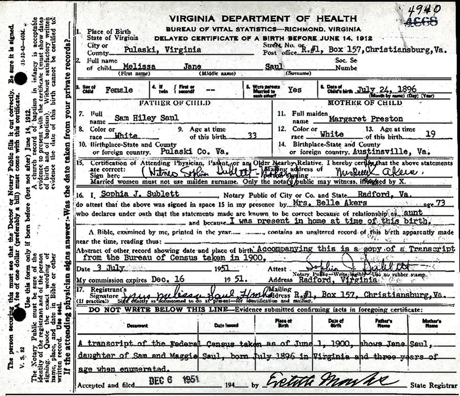 Born: July 24, 1896 in Pulaski County, Virginia.