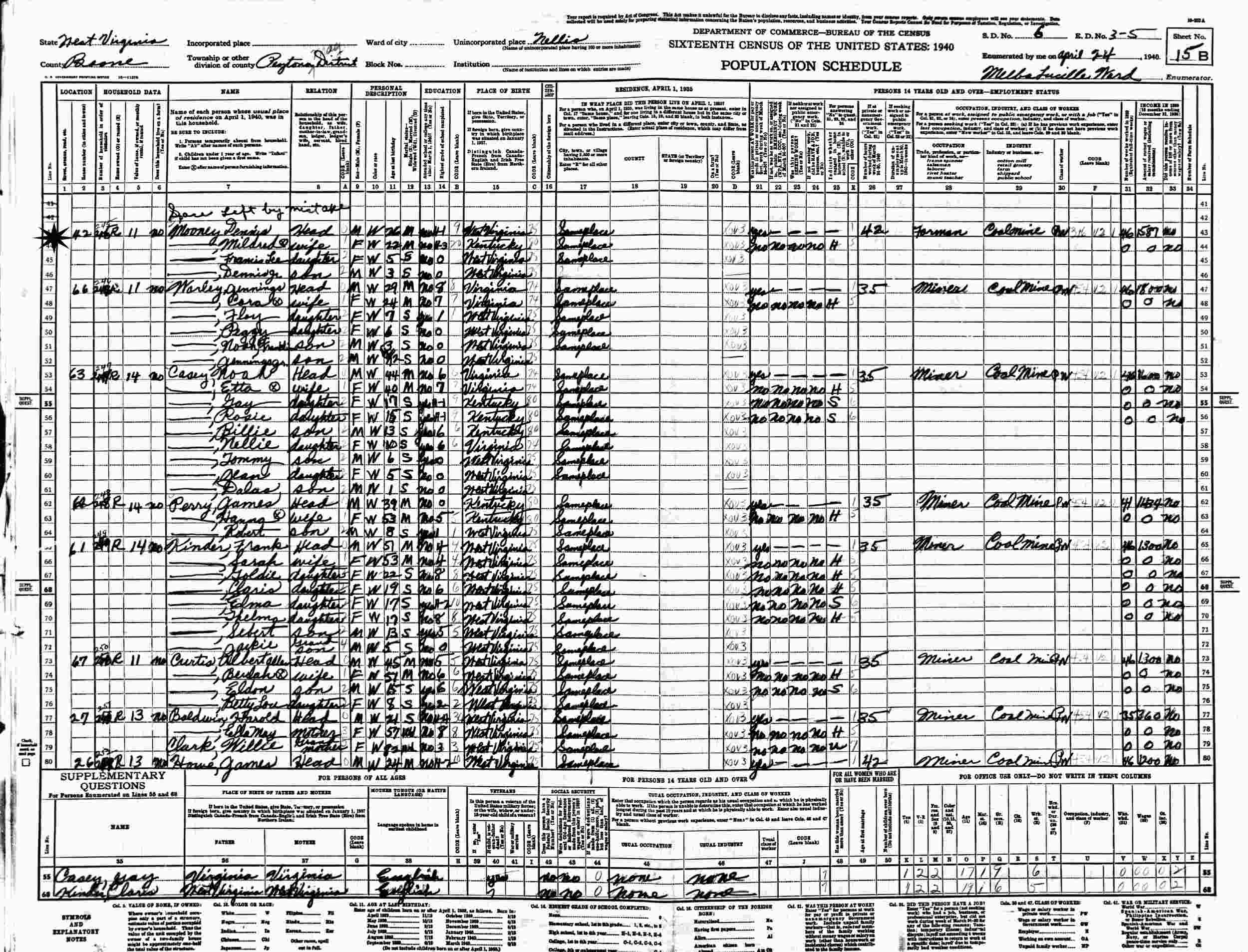 April 24, 1940 - Supervisor's District 4, Enumeration District 3-5, Peyton Magisterial District, Nellis, Boone County, West Virginia.