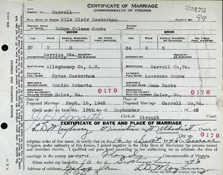 Married: Ruby Celene Combs September 16, 1945 in Carroll County, Virginia.