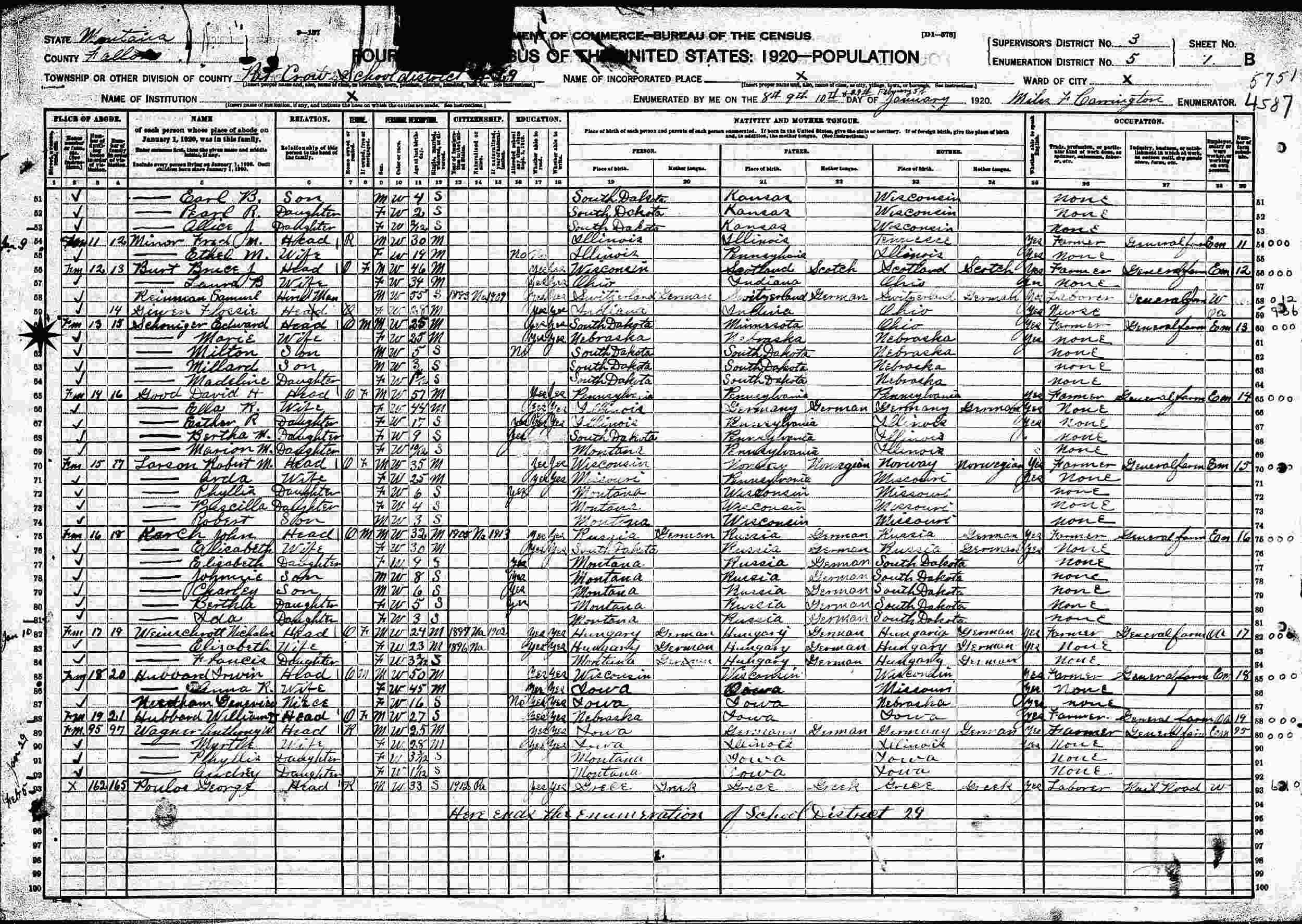 January 29-February 10, 1920 - Pat Crow School Dstrict, Supervisor's District 3, Enumeration 5, Fallon County, Montana.