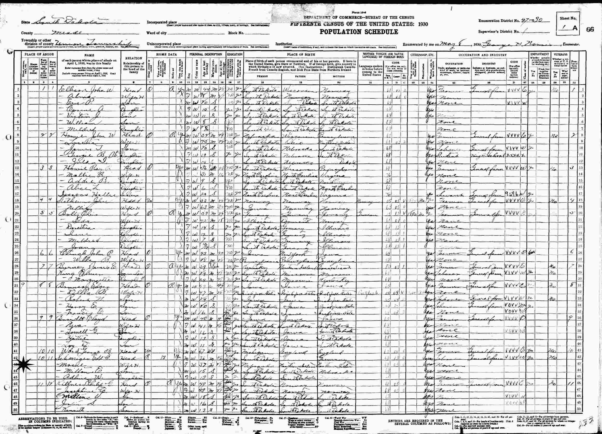 May 8, 1930 - Union Township, Supervisor's District 1, Enumeration District 47-30, Meade County, South Dakota.