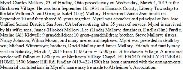 Died: March 4, 2015 in Findlay, Hancock County, Ohio.