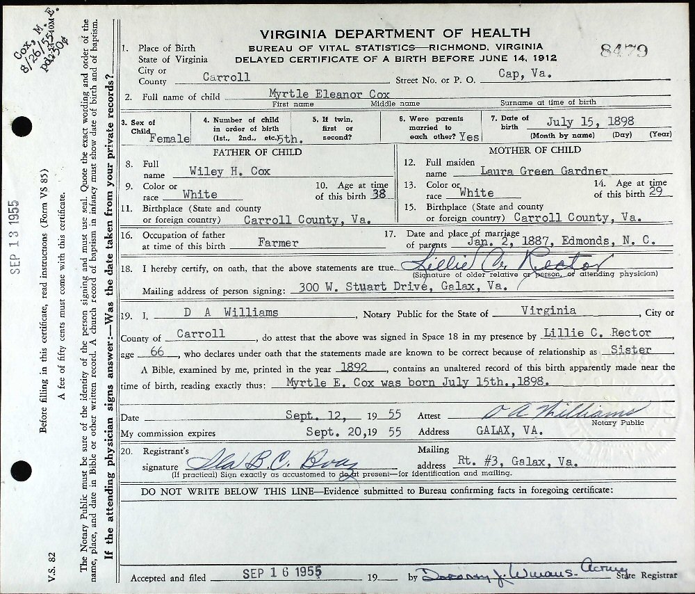 Daughter of Wiley H and Laura Green (Gardner) Cox.