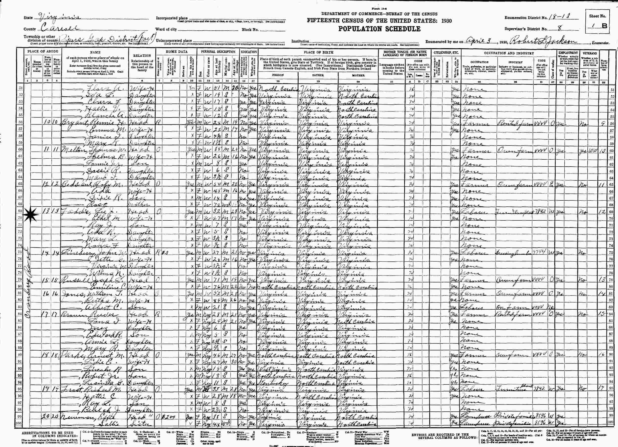 April 3, 1930 - Cranberry Road, Supervisor's District 8, Enumeration District 18-13, Pipers Gap District, Carroll County, Virginia.