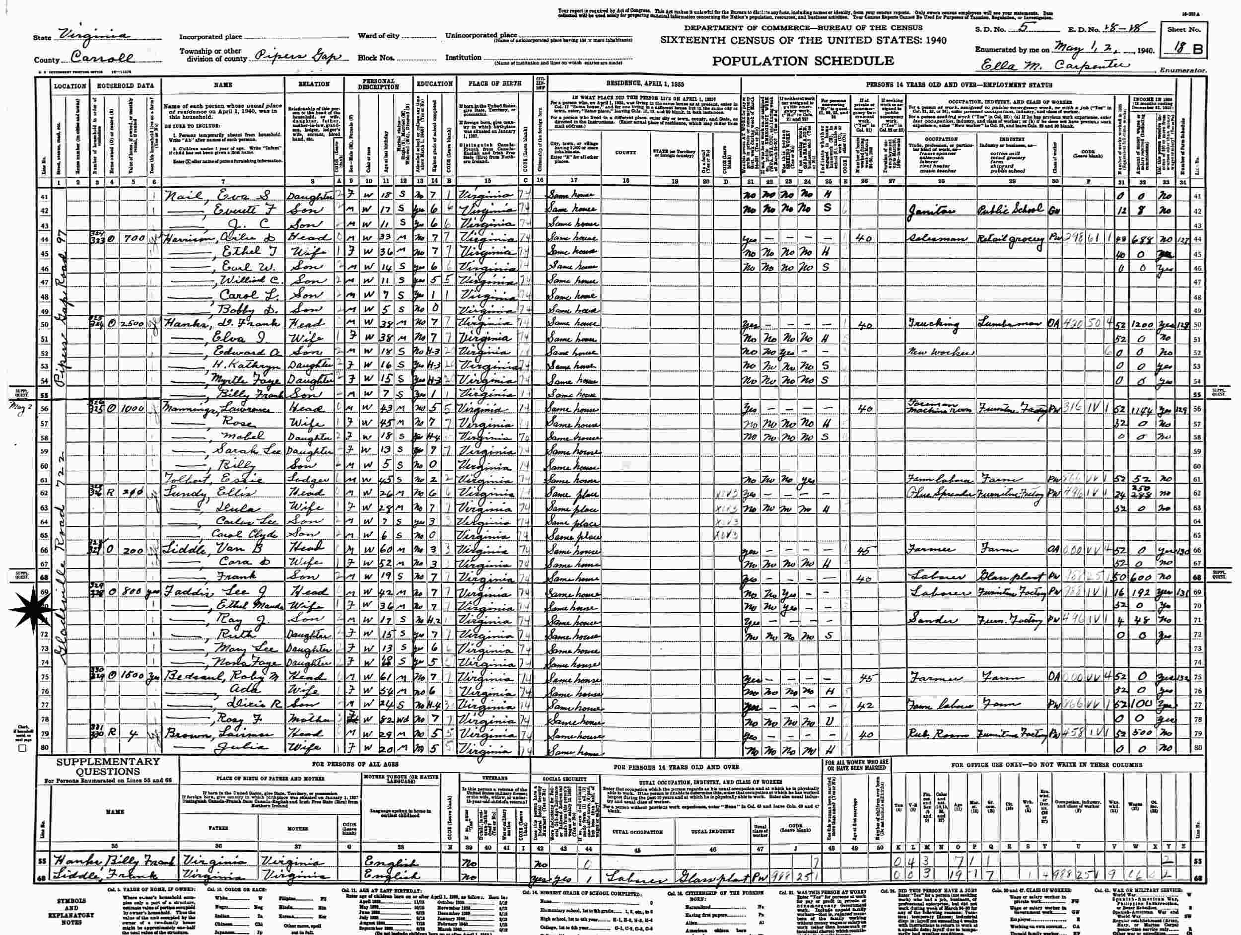 May 2, 1940 - Gladeville Road 722, Supervisor's District 5, Enumeration District 18-18, Pipers Gap, Carroll County, Virginia.