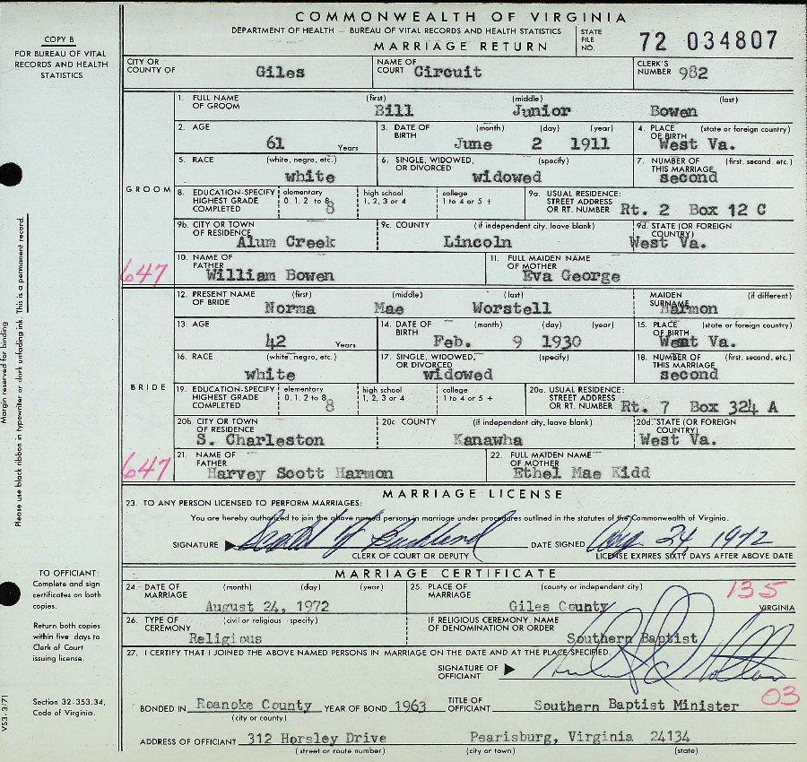 (2) Billie Junior Bowen August 24, 1972 in Giles, Virginia. (He married (1) Marcel Jane Peters b. August 21, 1914, Unknown; d. September 4, 1971, Alum Creek Lincoln County, West Virginia.)