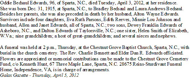 Buried: April 5, 2012 in Chestnut Grove Baptist Church Cemetery, Sparta, Alleghany County, North Carolina.