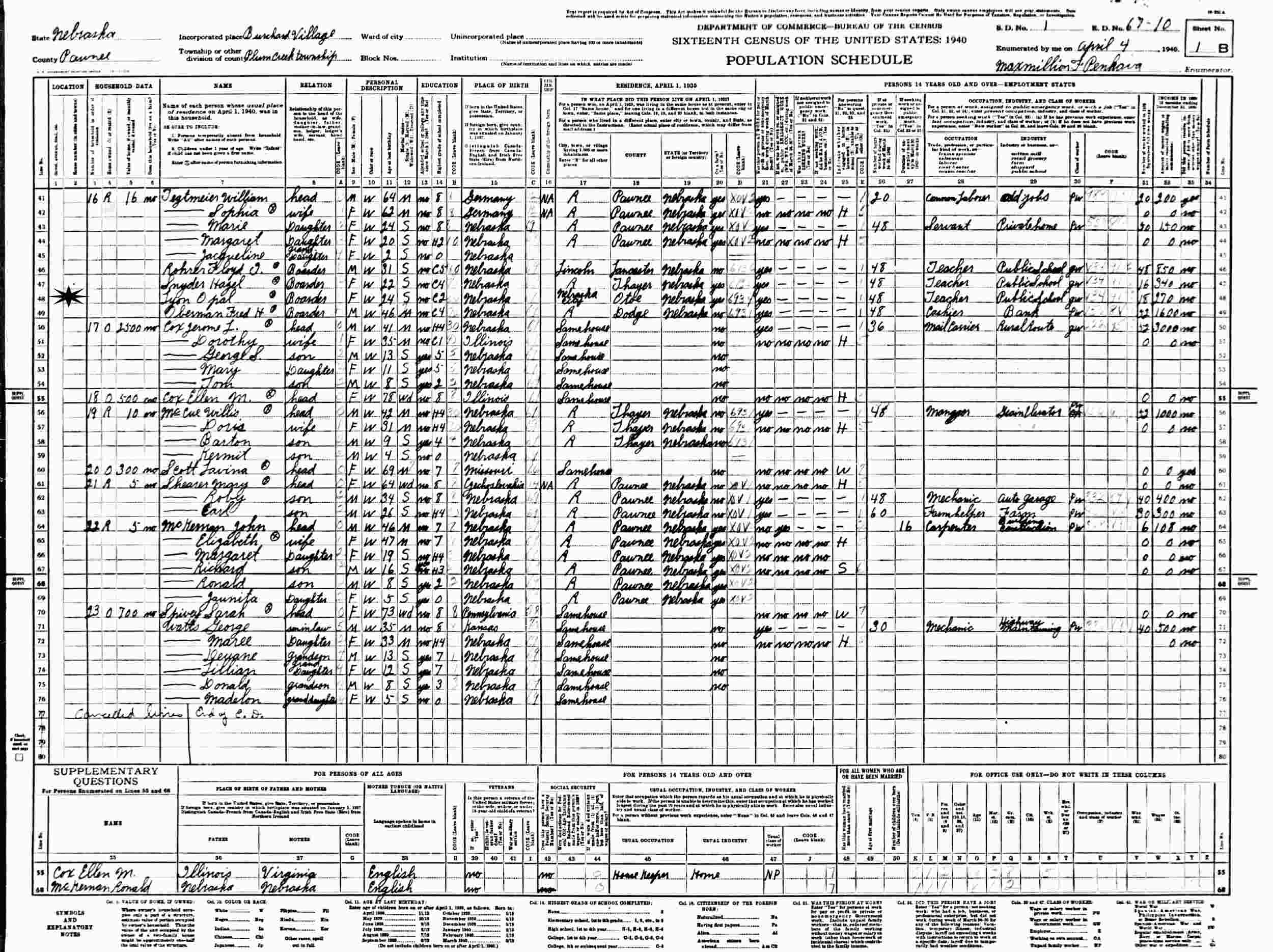 April 4, 1940 - Supervisor's District 1, Enumeration District 67-10, Plum Creek Township, Burchard Village Pawnee County, Nebraska (Boarder).