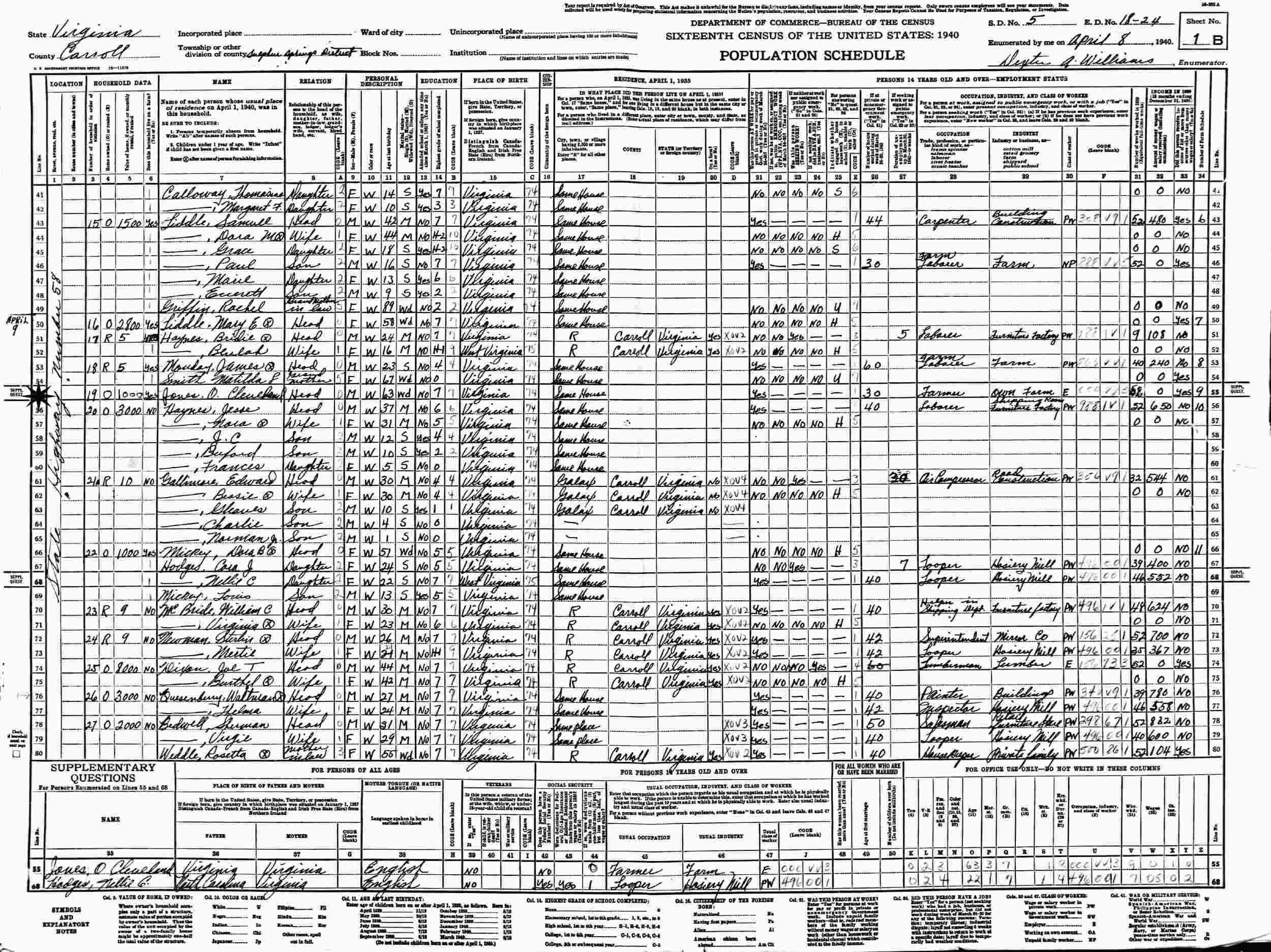 April 8, 1940 - State Highway Number 58, Supervisor's District 5, Enumeration District 18-24, Sulphur Springs District, Carroll County, Virginia.