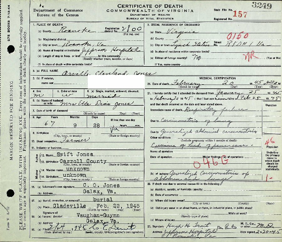 Died: February 20, 1945 in Jefferson Hospital, Roanoke, Virginia.