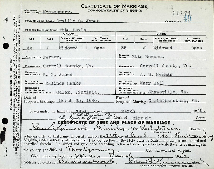 (2) Etta (nee Newman) Davis March 23, 1940 in Christiansburg, Montgomery County, Virginia. (b. 1905, Unknown. d. after 1945. She was widowed).