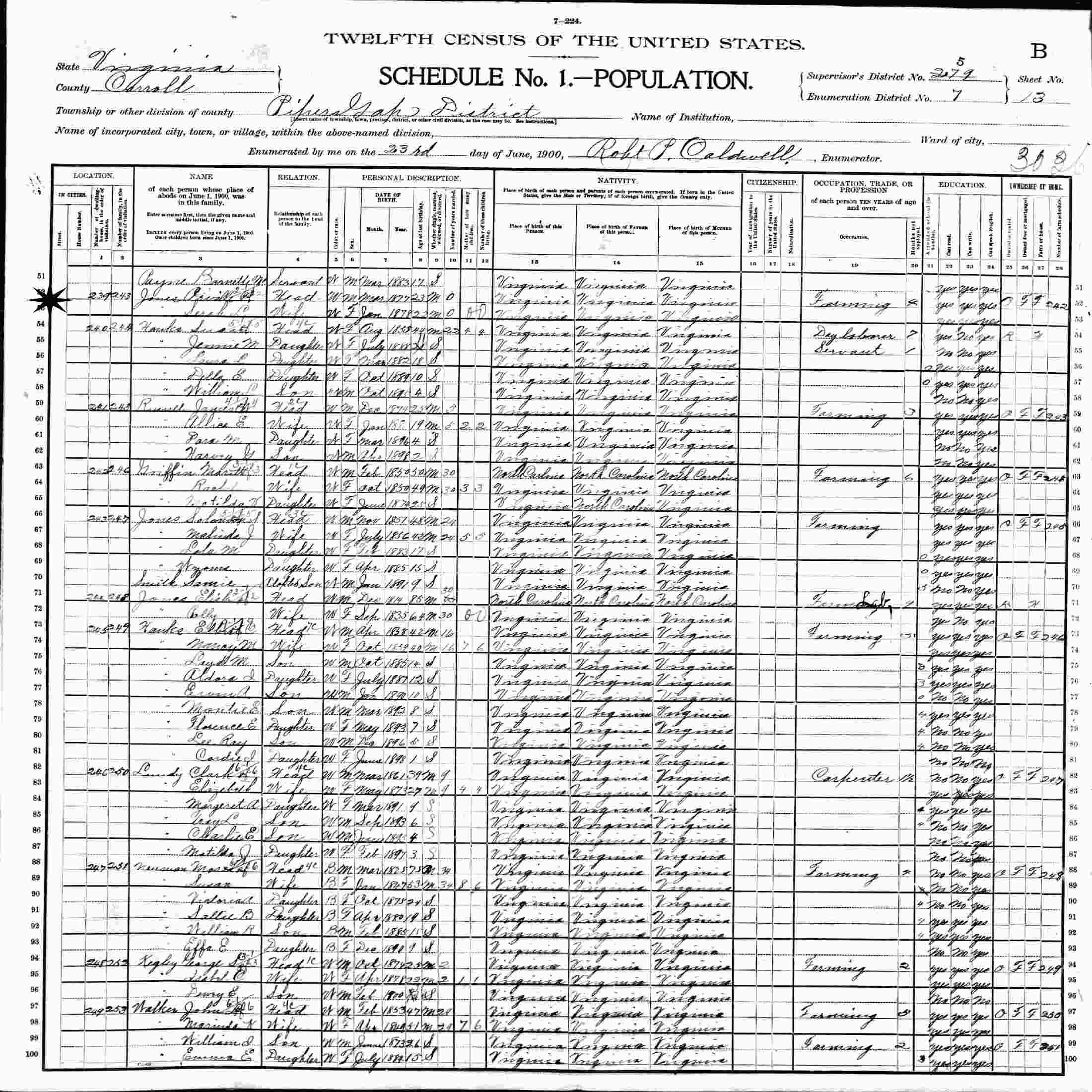 June 23, 1900 - Pipers Gap District, Supervisor's District 279, Enumeration District 7, Carroll County, Virginia.