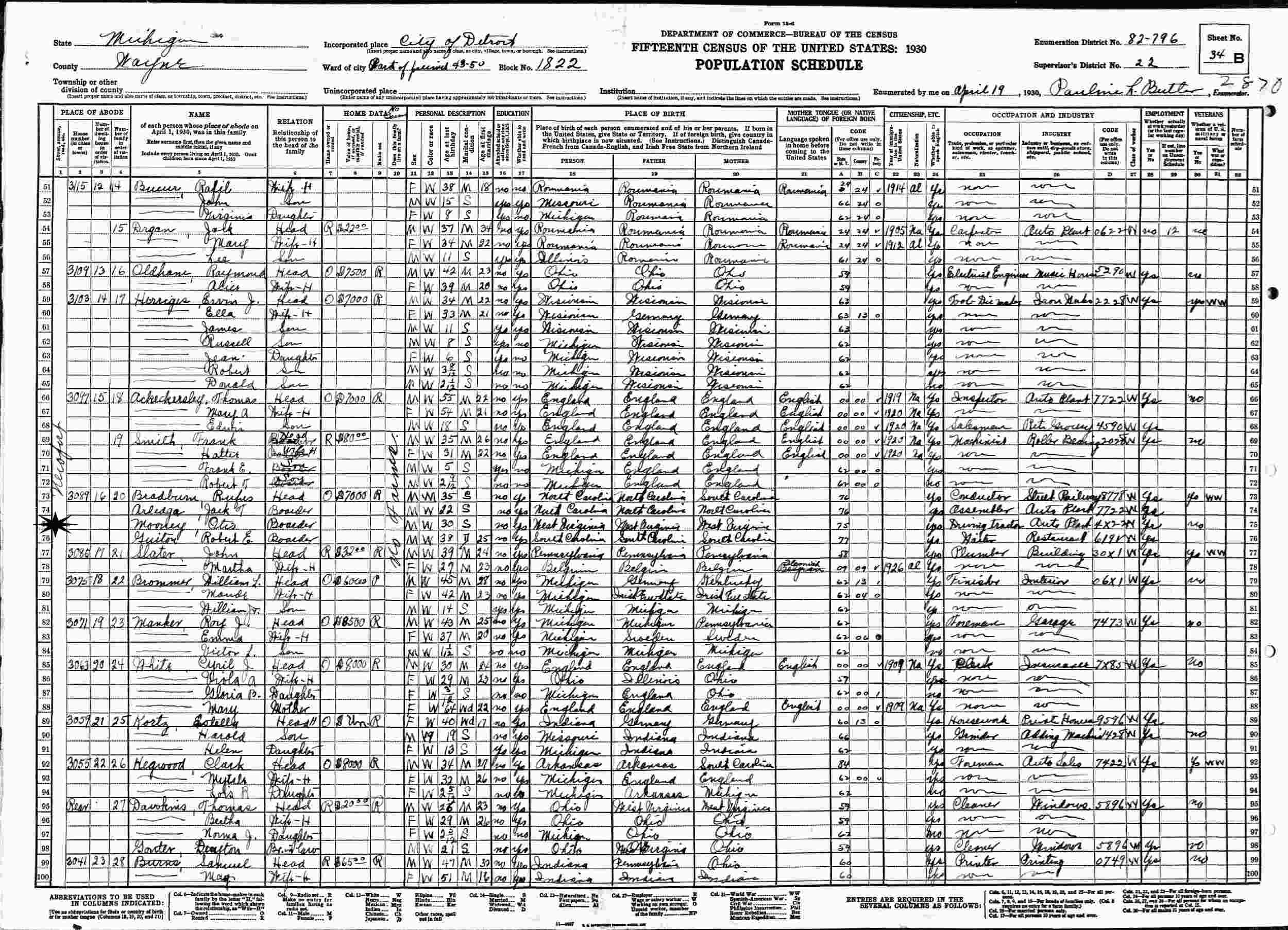 April 19, 1930 - 3089 Newport, Precinct 43-50, Block 1822, Supervisor's District 22, Enumeration District 82-796, Detroit, Wayne County, Michigan (Boarder).