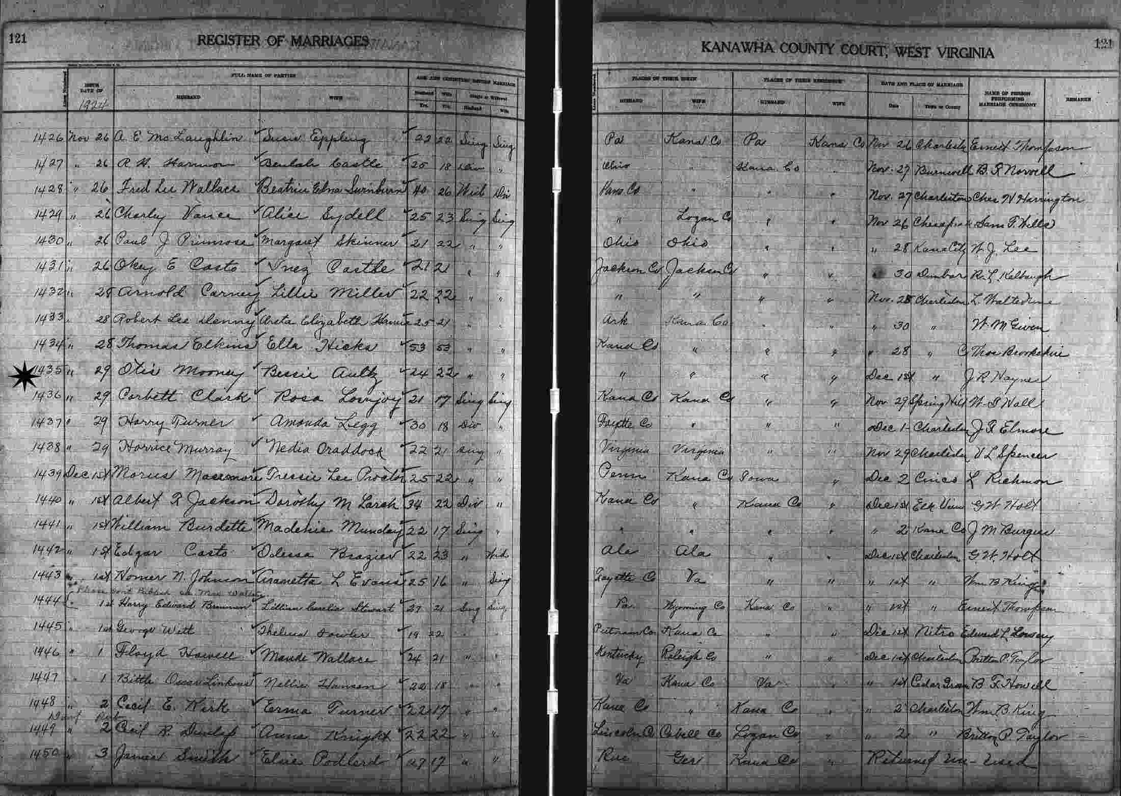 Married: (1) Bessie Aultz November 24, 1924 in Kanawha County, West Virginia.