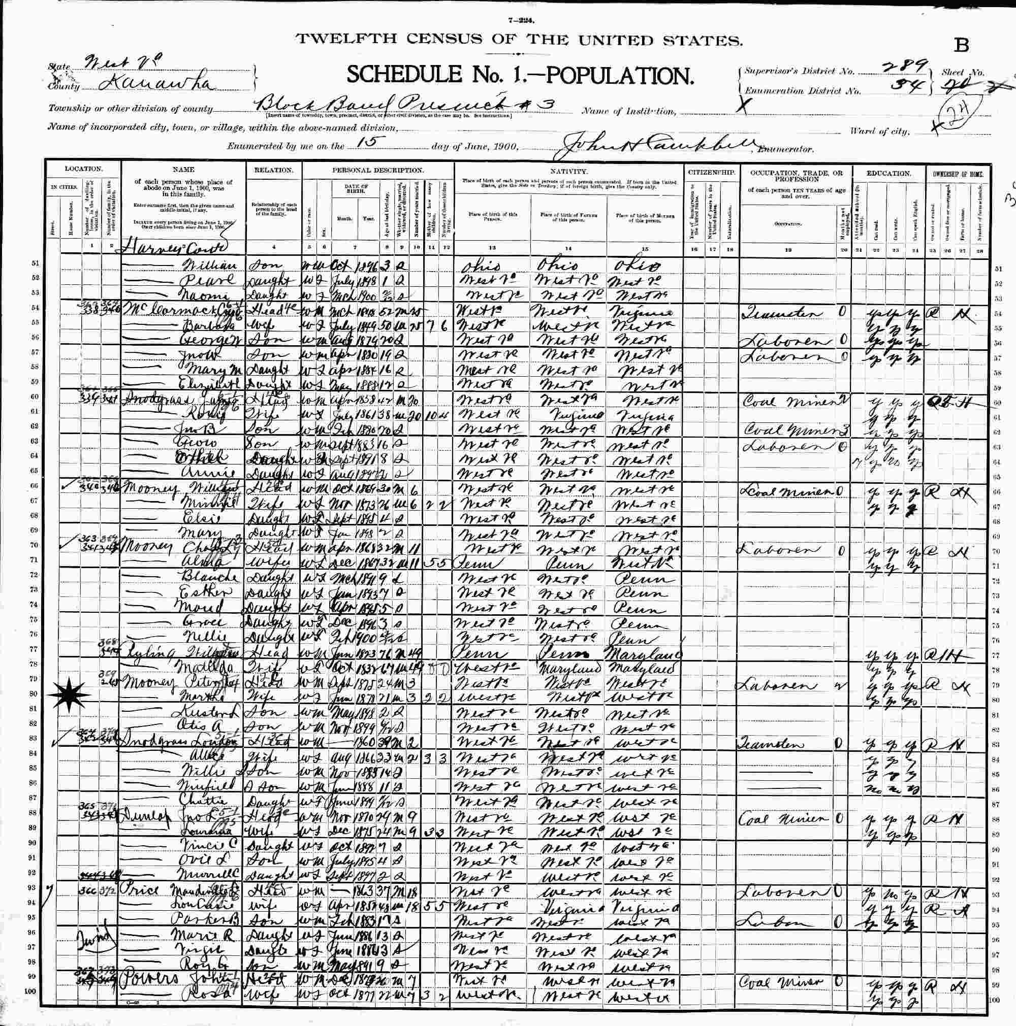 June 15, 1900 - Black Band Precinct 3, Supervisor's District 289, Enumeration District 34, Kanawha County, West Virginia.