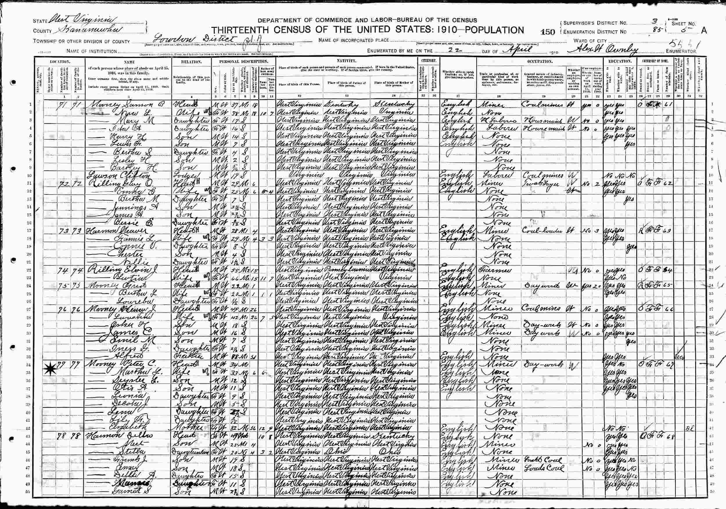 April 22, 1910 - Supervisor's District 3, Enumeration District 85, Loudon, Kanawha County, West Virginia.