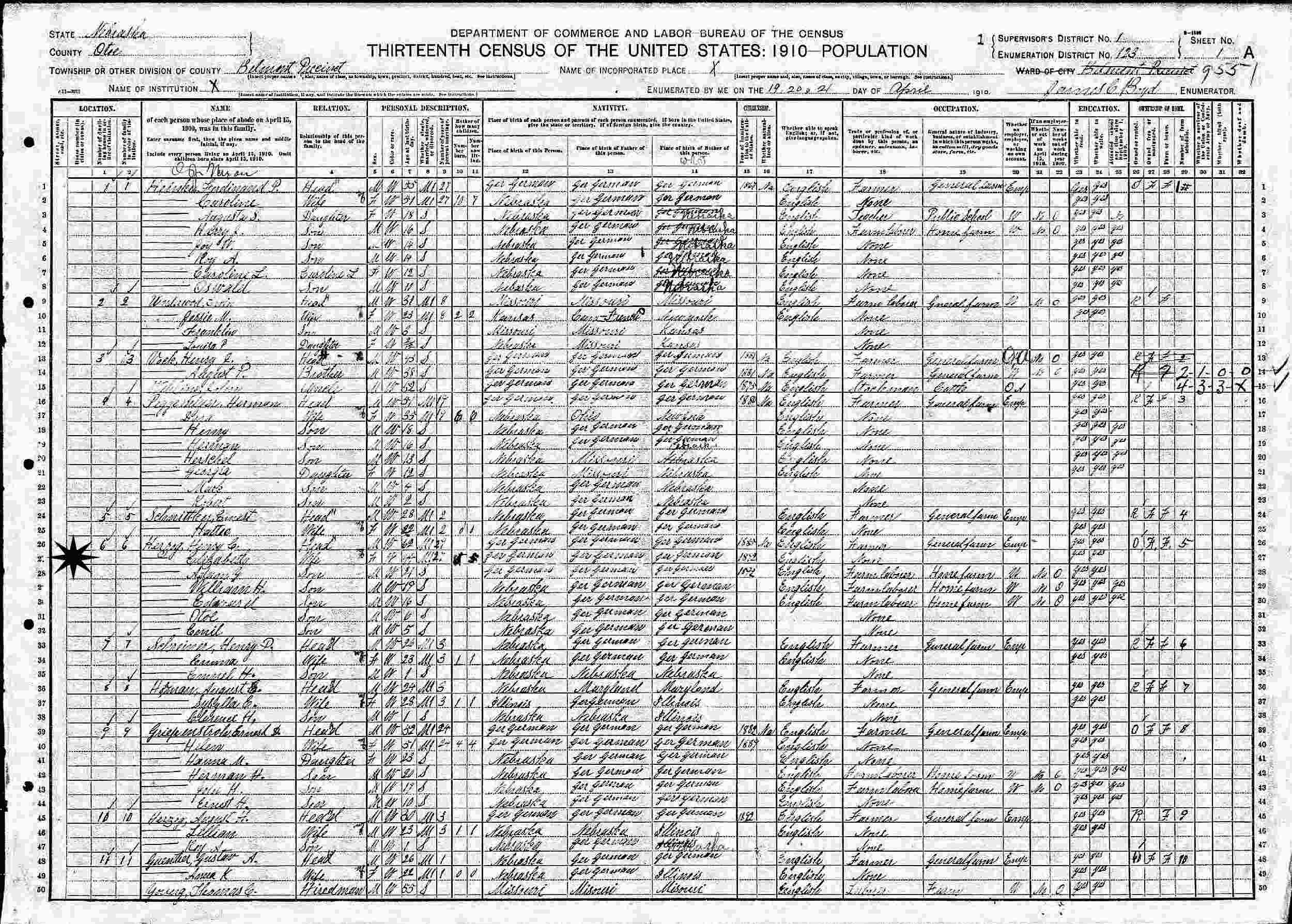 April 19-21, 1910 - Supervisor's District 1, Enumeration District 123, Belmont Precinct, Otoe County, Nebraska.