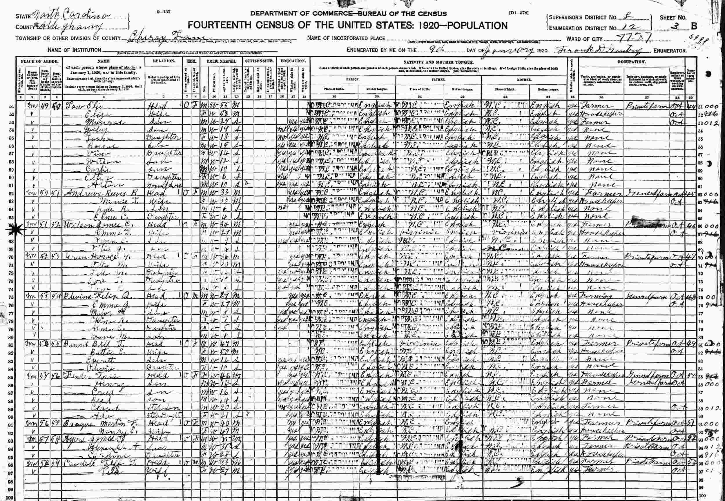 January 9, 1920 - Cherry Lane Township, Ward 7727, Supervisor's District ?, Enumeration District 12, Alleghany County, North Carolina.