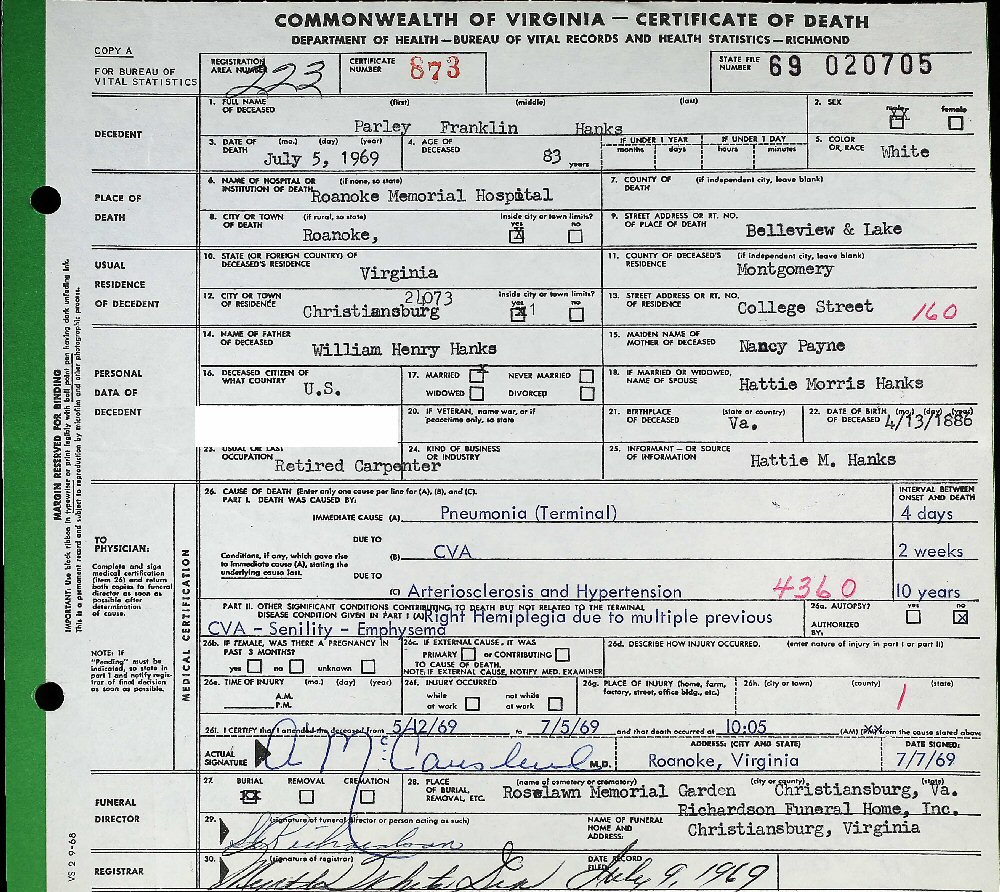 Last Residence: Christiansburg, Montgomery County, Viriginia.