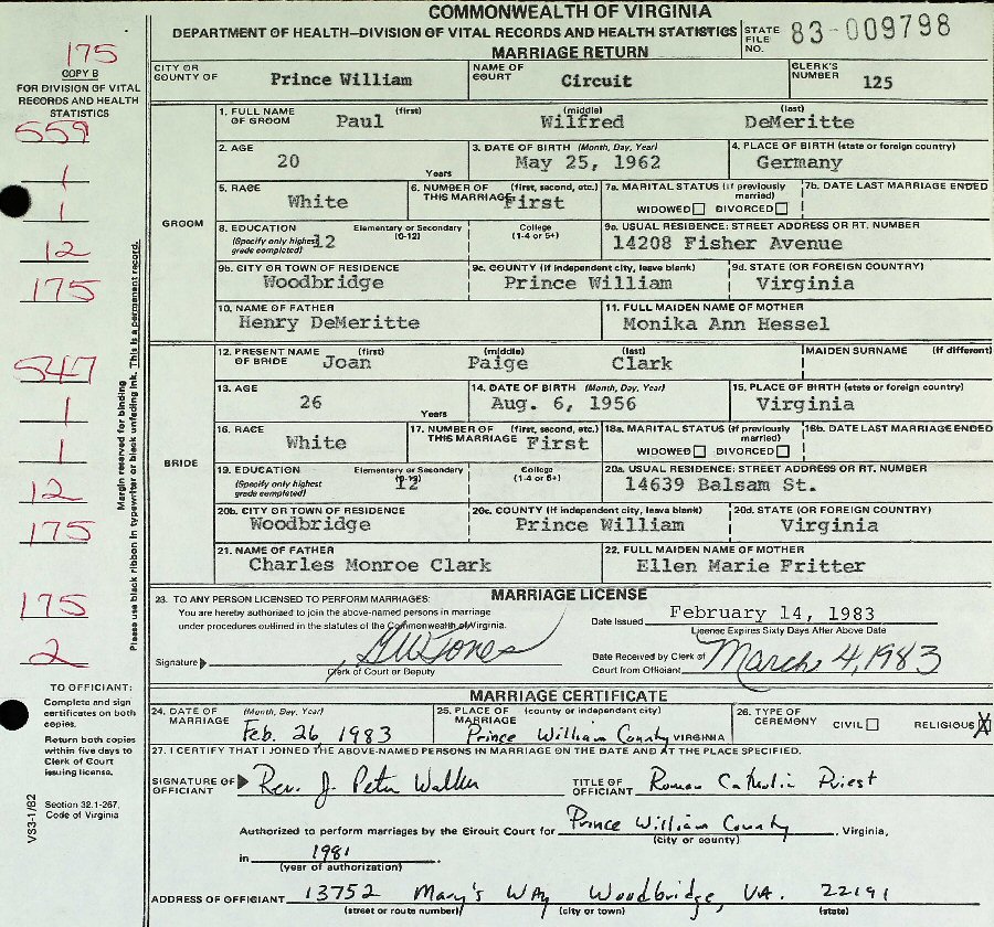 Married: Joan Paige Clark February 26, 1983 in Prince William County, Virginia.