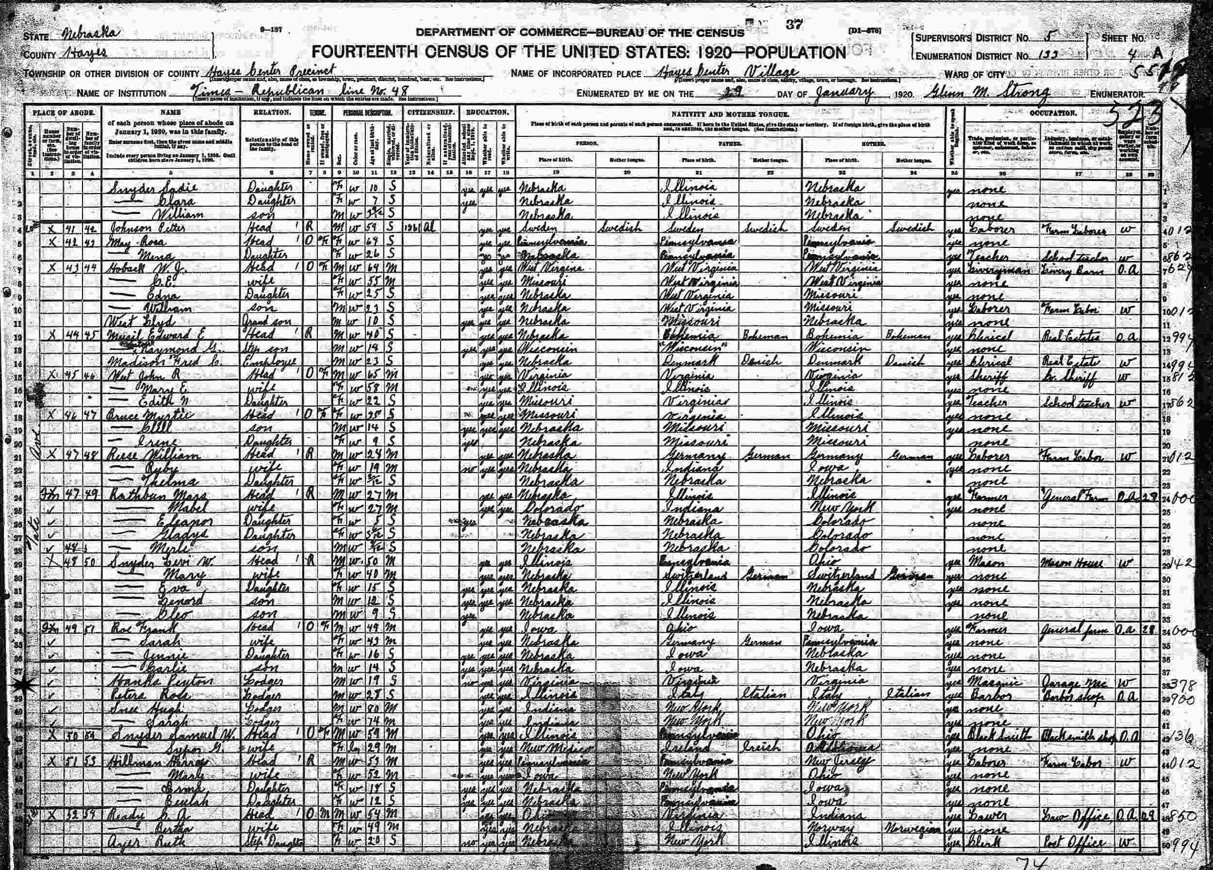 January 29, 1920 - Institution: Times-Repubican Line No. 48, 9 Nate Street, Hayes Center Village, Supervisor's District 5, Enumeration District 133, Hayes County, Nebraska (Lodger).