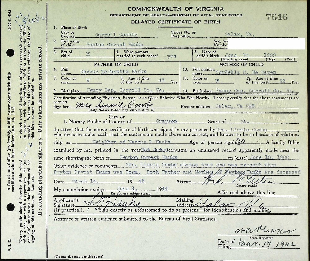 Born: June 10, 1900 in Galax, Carroll County, Virginia.