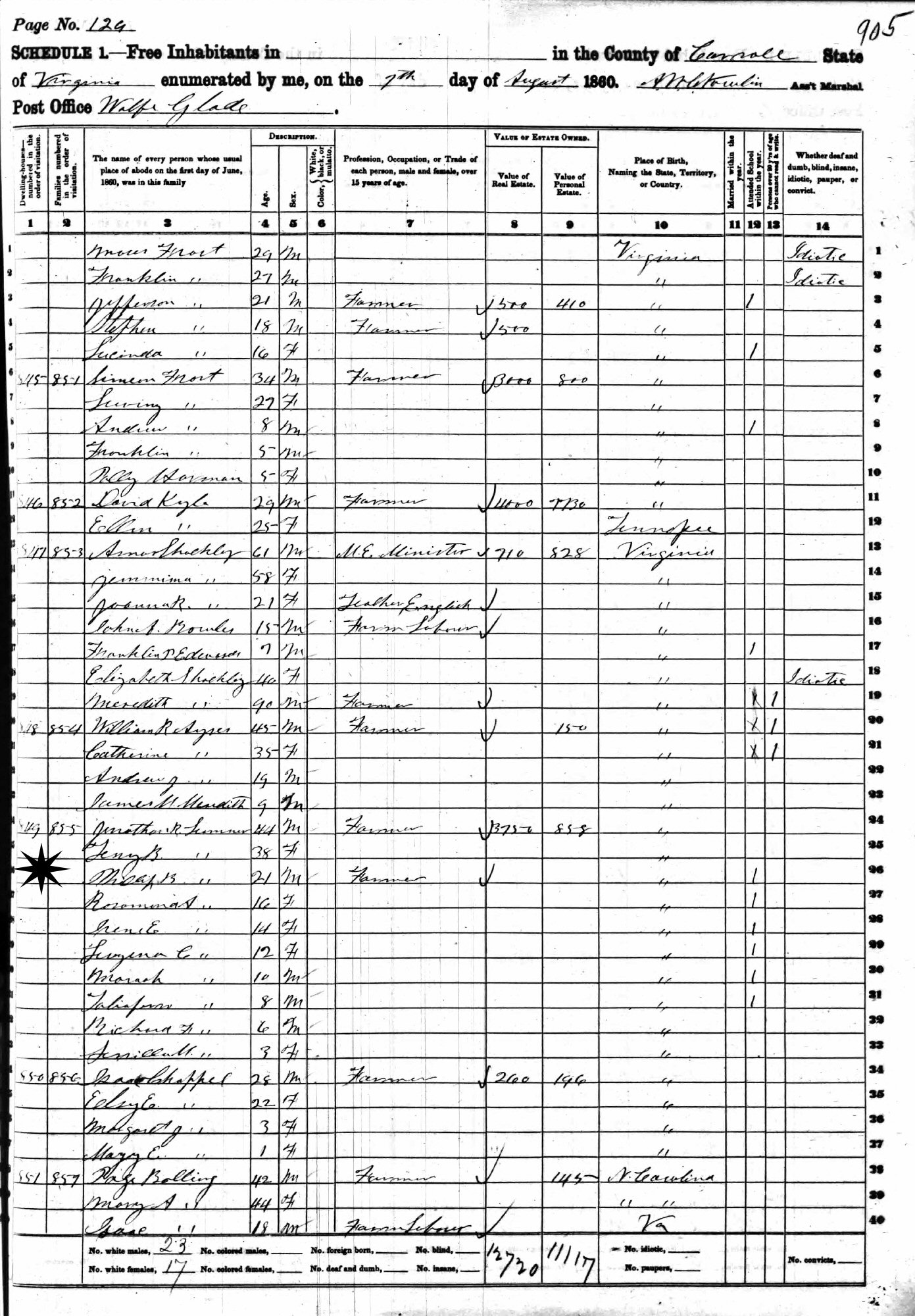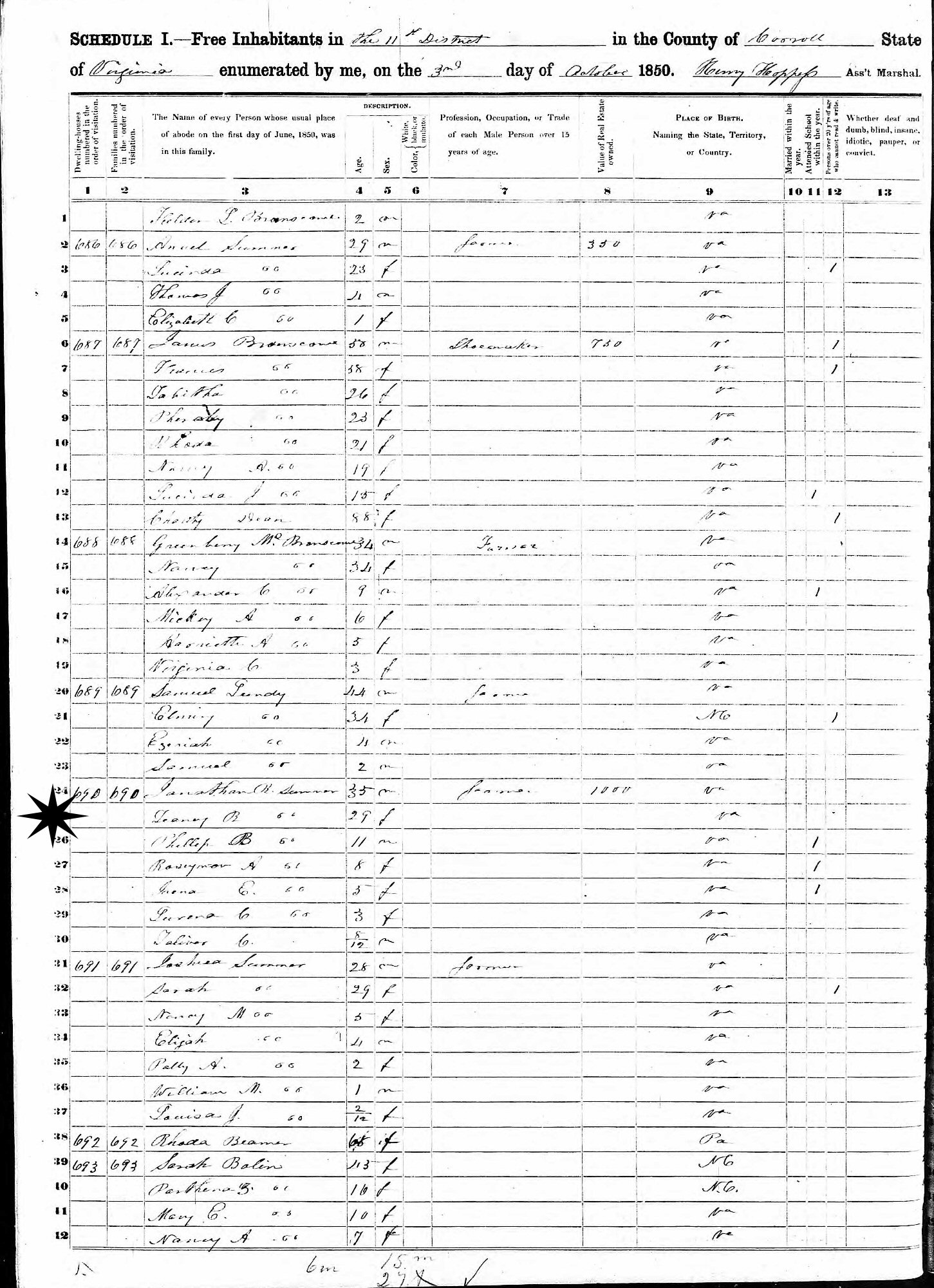 October 3, 1850 - District 11, Carroll County, Virginia.