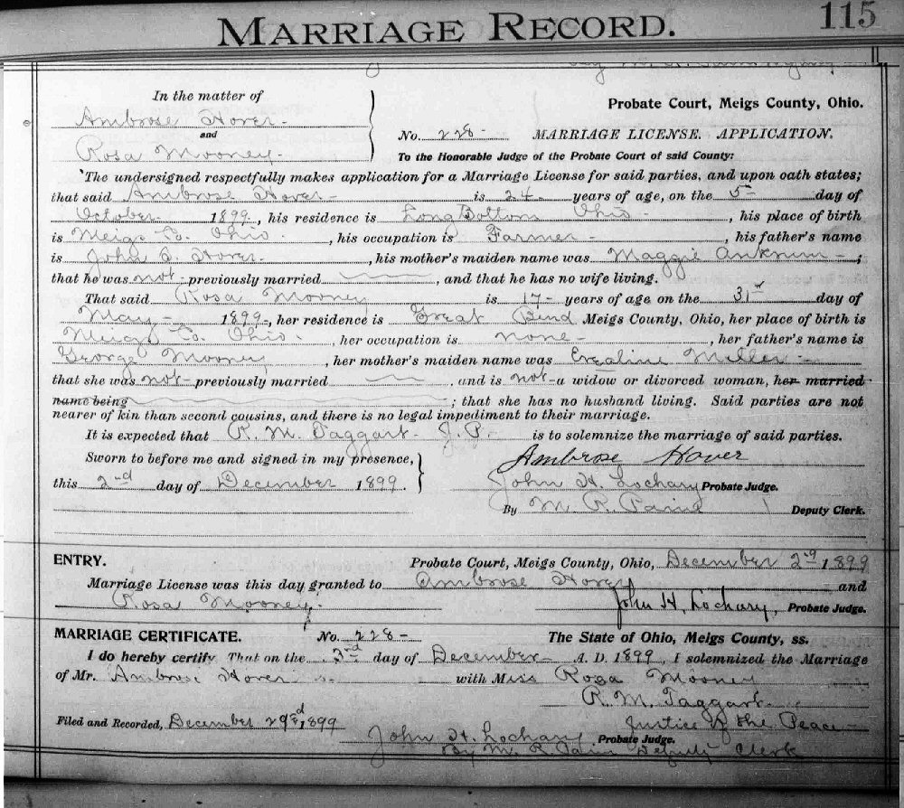 Married: (1) Ambrose Hover December 3, 1899 in Meigs County, Ohio.