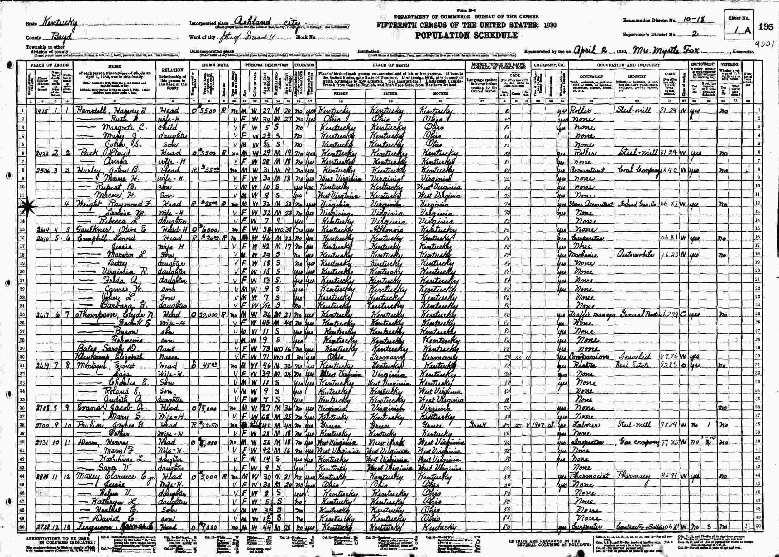April 2, 1930 - 2506 ?, Ward 4, Supervisor's District 2, Enumeration District 10-18, Ashland, Boyd County, Kentucky.