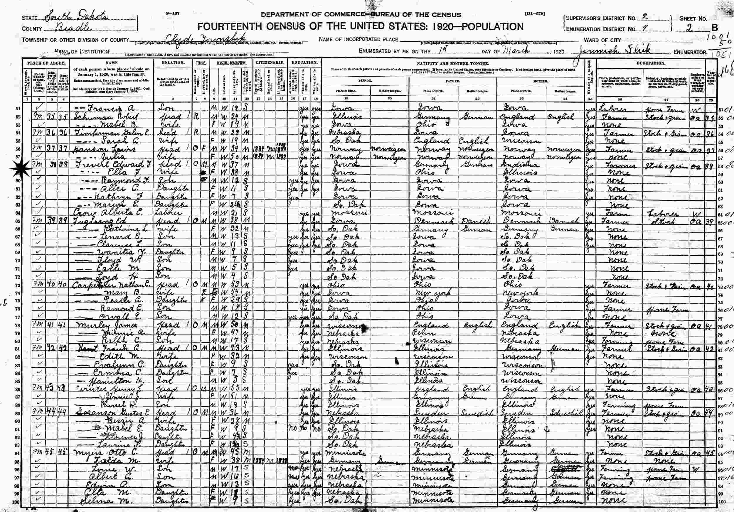 March 1, 1920 - Clyde, Supervisor's District 2, Enumeration District 9, Beadle County, South Dakota.