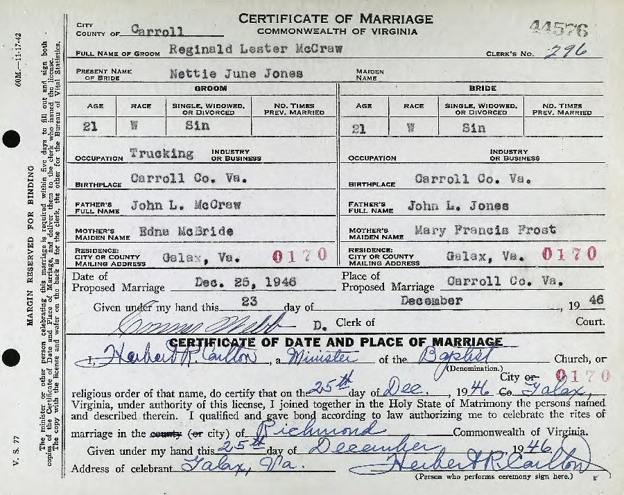Married: Nettie June Jones Decemer 24, 1946 in Galax, Virginia.