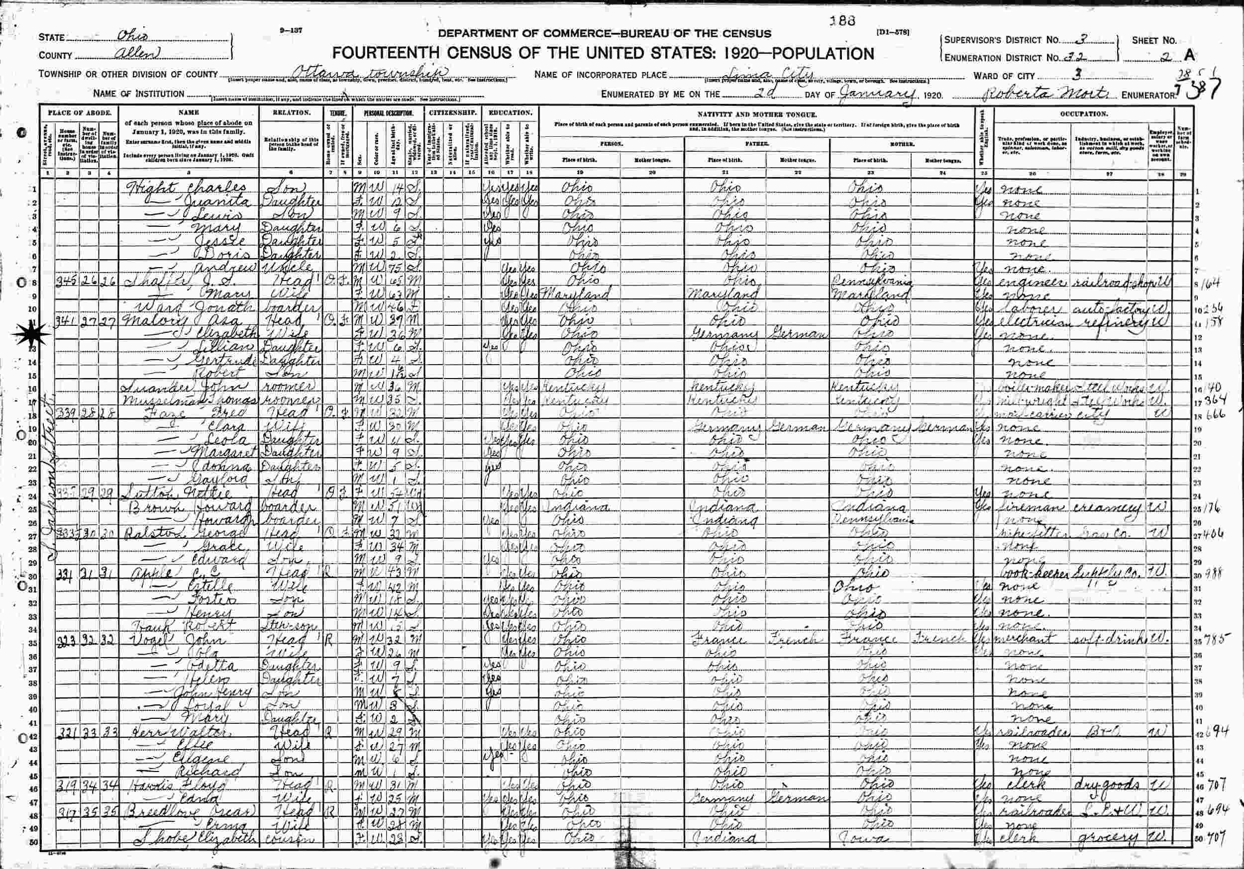 January 2, 1920 - 341 S Jackson Street, Ward 3, Supervisor's District 3, Enumeration District 32, Ottawa Township, Lima, Allen County, Ohio.