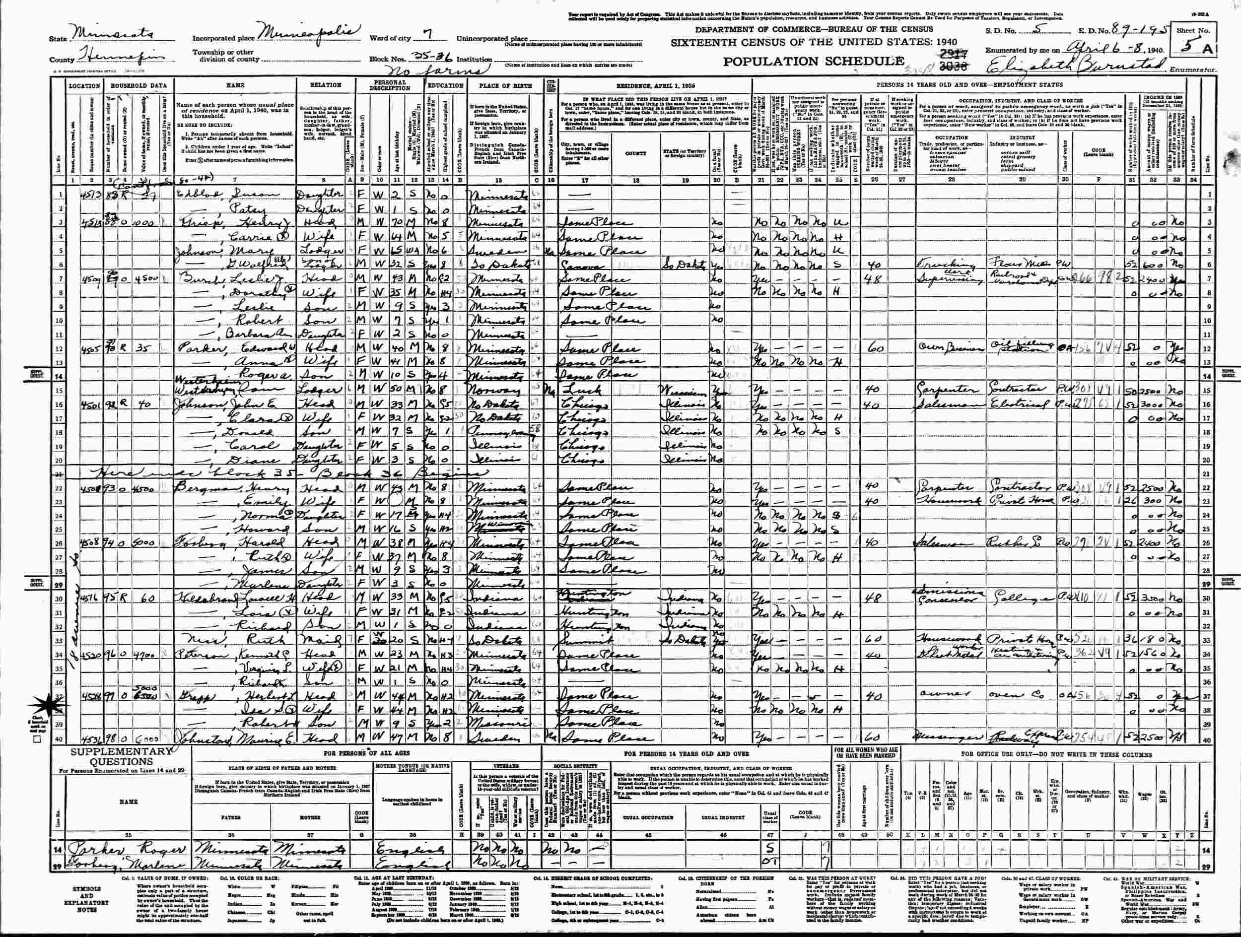 April 6-8, 1940 - 4528 18th Avenus South, Ward 7, Block 35-36, Supervisor's District 5, Enumeration District 89-195, Minneapolis, Hennepin County, Minnesota.