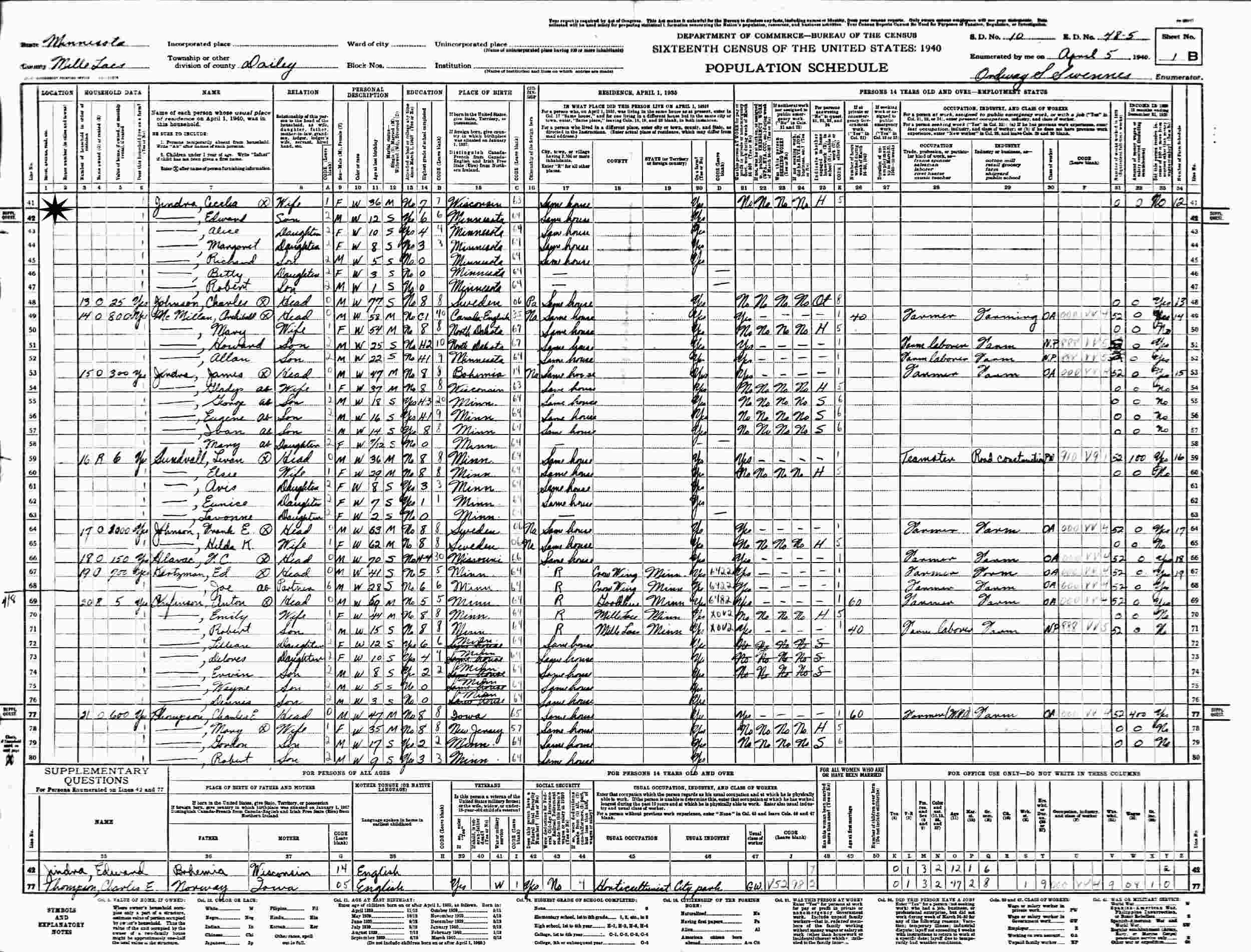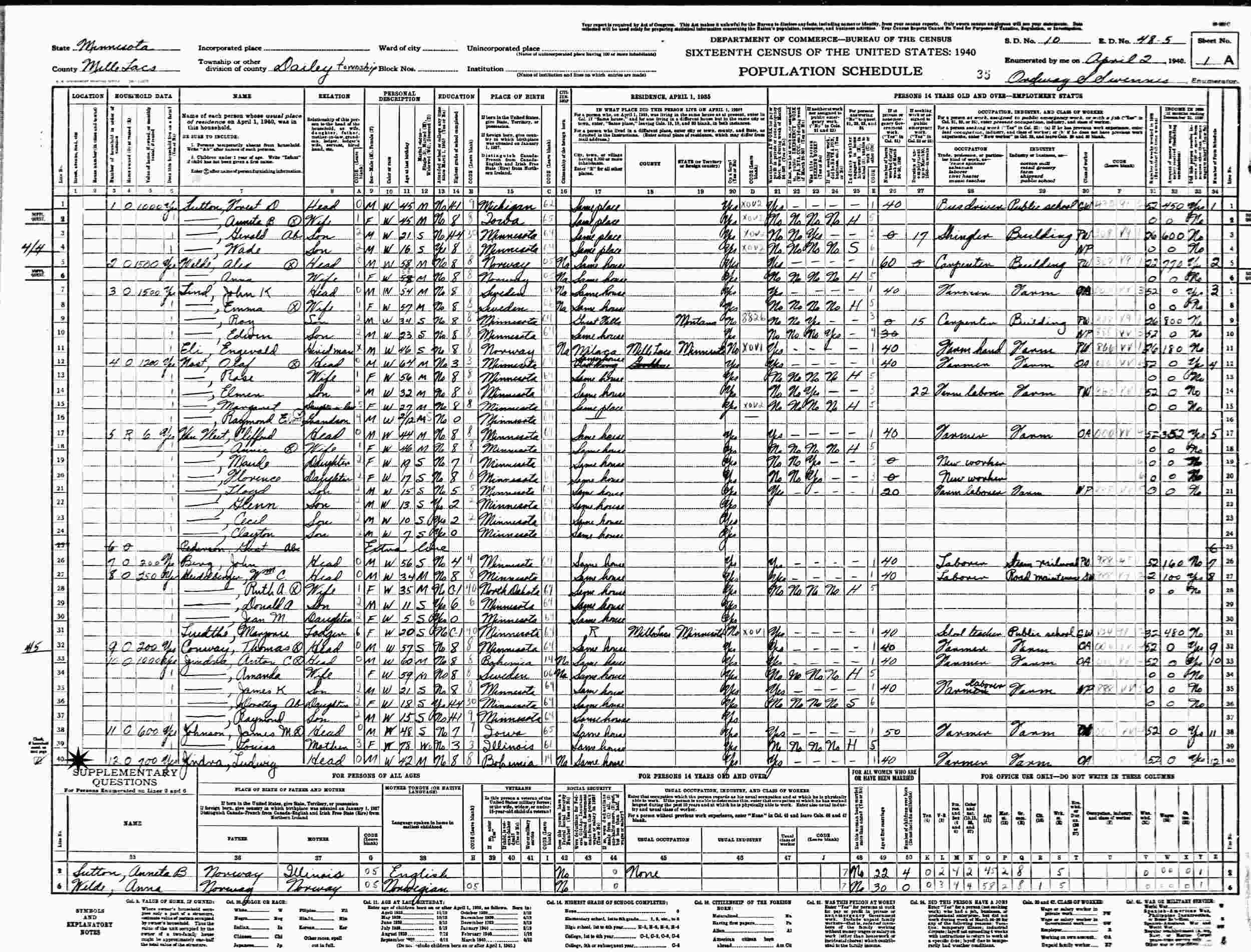 April 5, 1940 - Dailey, Supervisor's District 10, Enumeration District 48-5, Mille Lacs County, Minnesota.