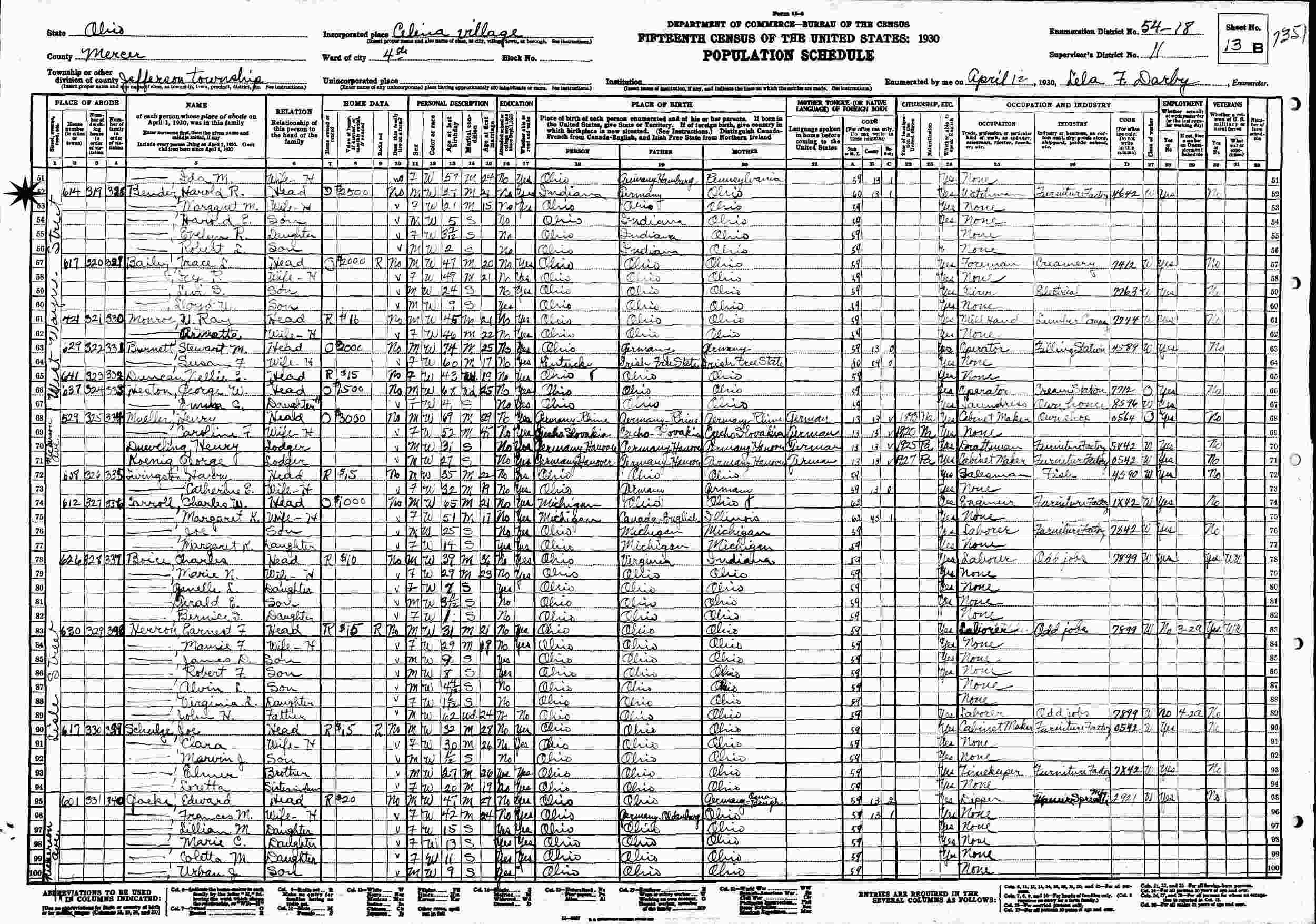 April 12, 1930 - 614 West Wayne Street, Ward 4, Supervisor's District 11, Enumeration District 54-18, Jefferson Township, Celina, Mercer County, Ohio.