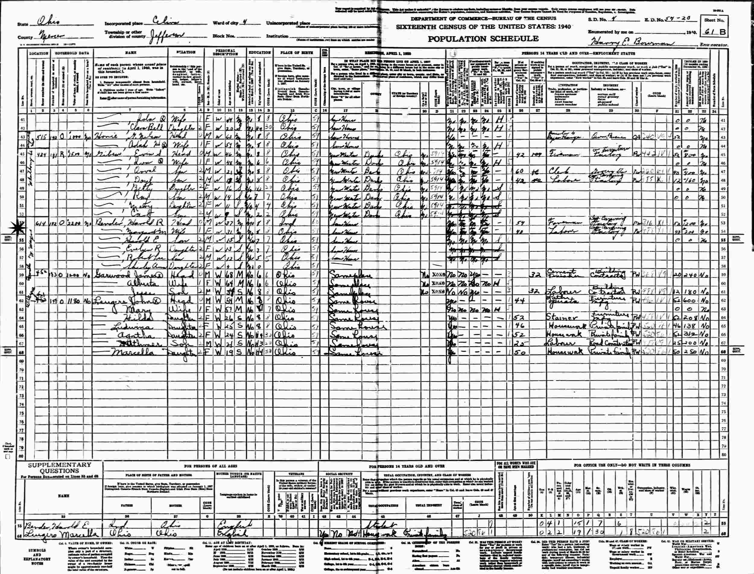 1940 - 614 West Wayne Street, Ward 4, Supervisor's District 4, Enumeration District 54-20, Jefferson Township, Celina, Mercer County, Ohio.