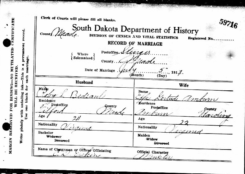 Married: (1) Effa Gertrude Amburn July 5, 1917 in Sturgis, Meade County, South Dakota.