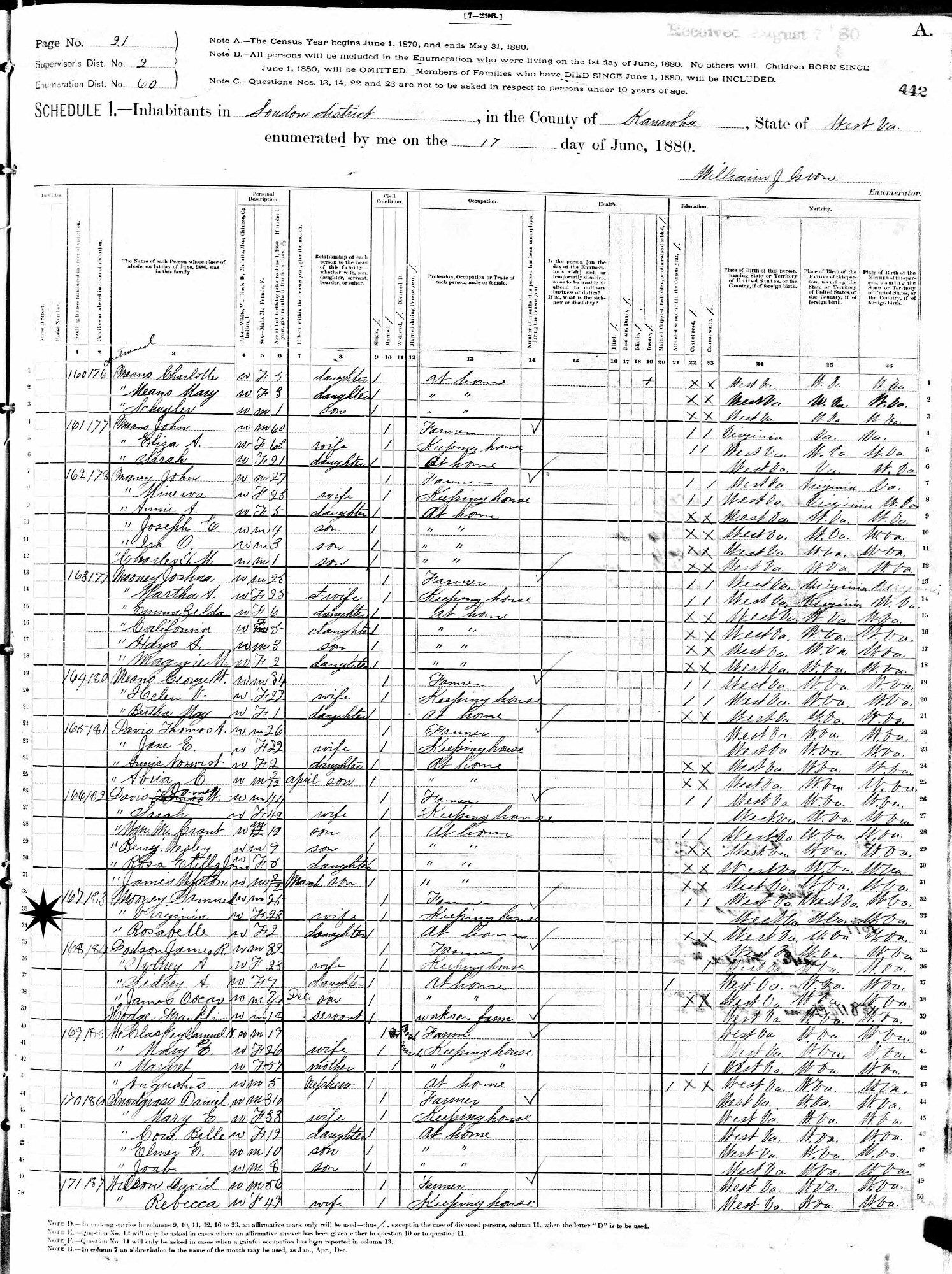 June 17, 1880 - Supervisor's District 2, Enumeration District 60, Loudon, Kanawha County, West Virginia.
