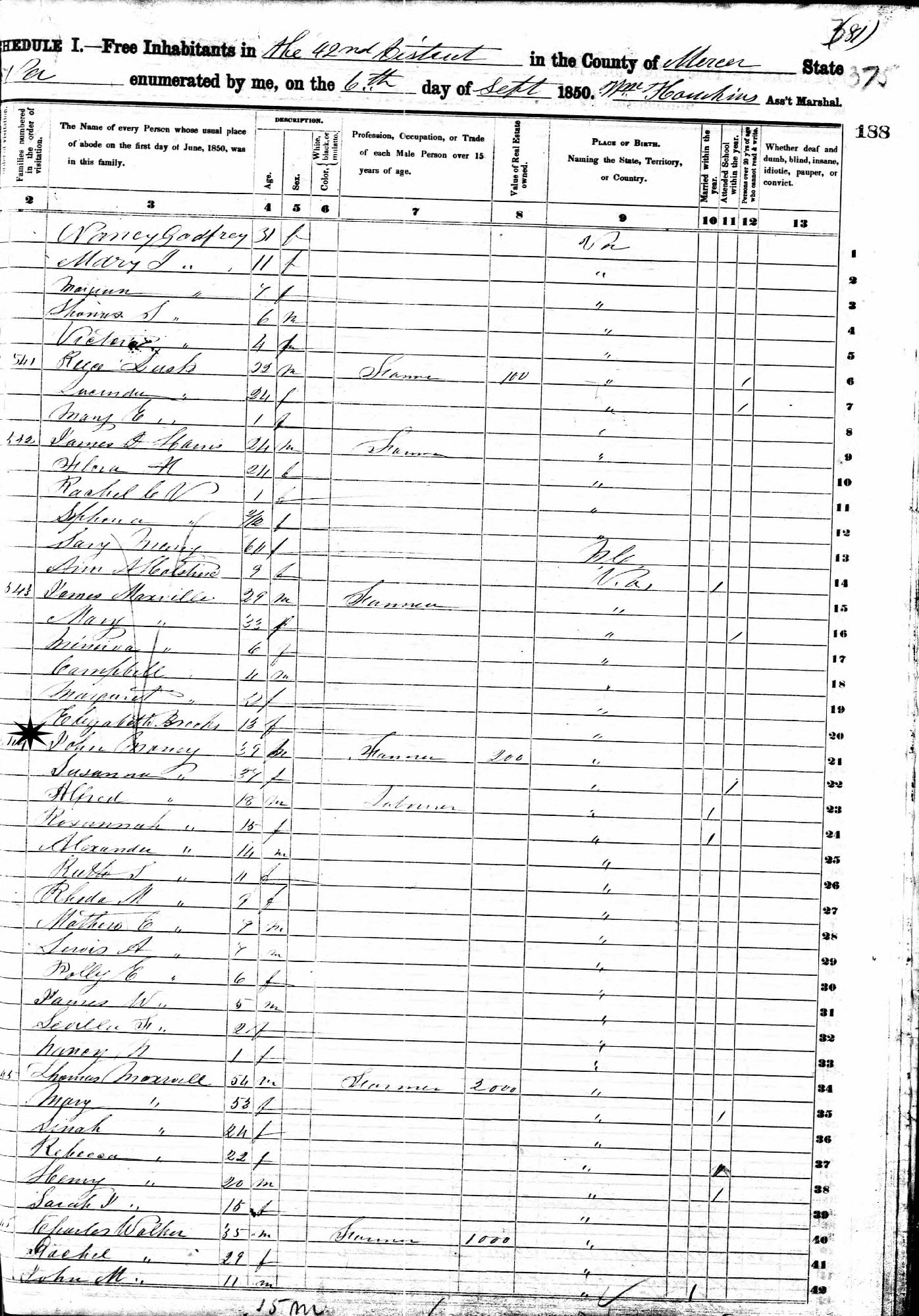 September 6, 1850 - 42nd District, Mercer County, Virginia (now West Virginia).