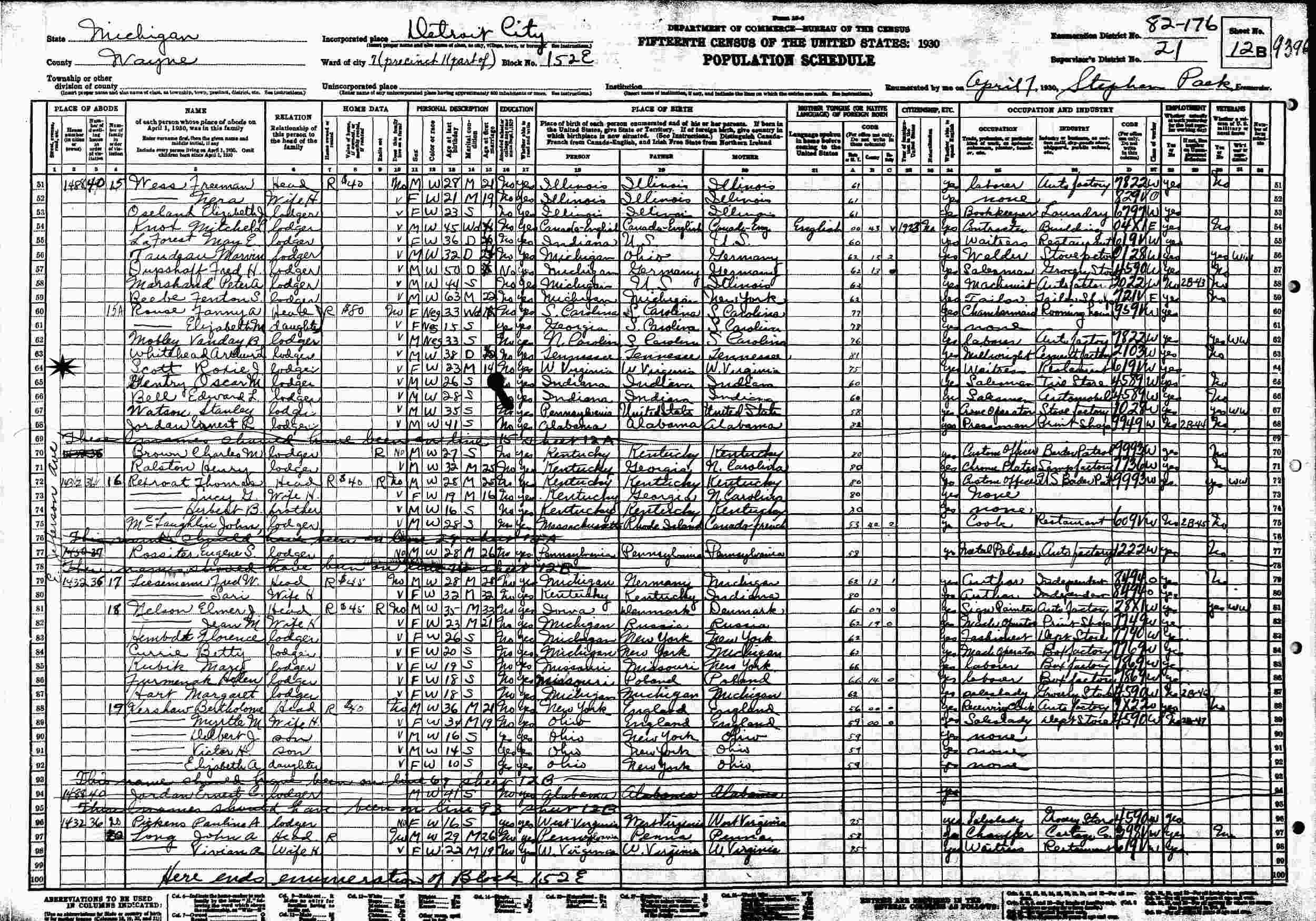 April 7, 1930 - 1488 Jefferson Avenue, Block 152E, Ward 7, Precinct 1, Supervisor's District 21, Enumeration District 82-176, Detroit, Wayne County, Michigan (Lodger).